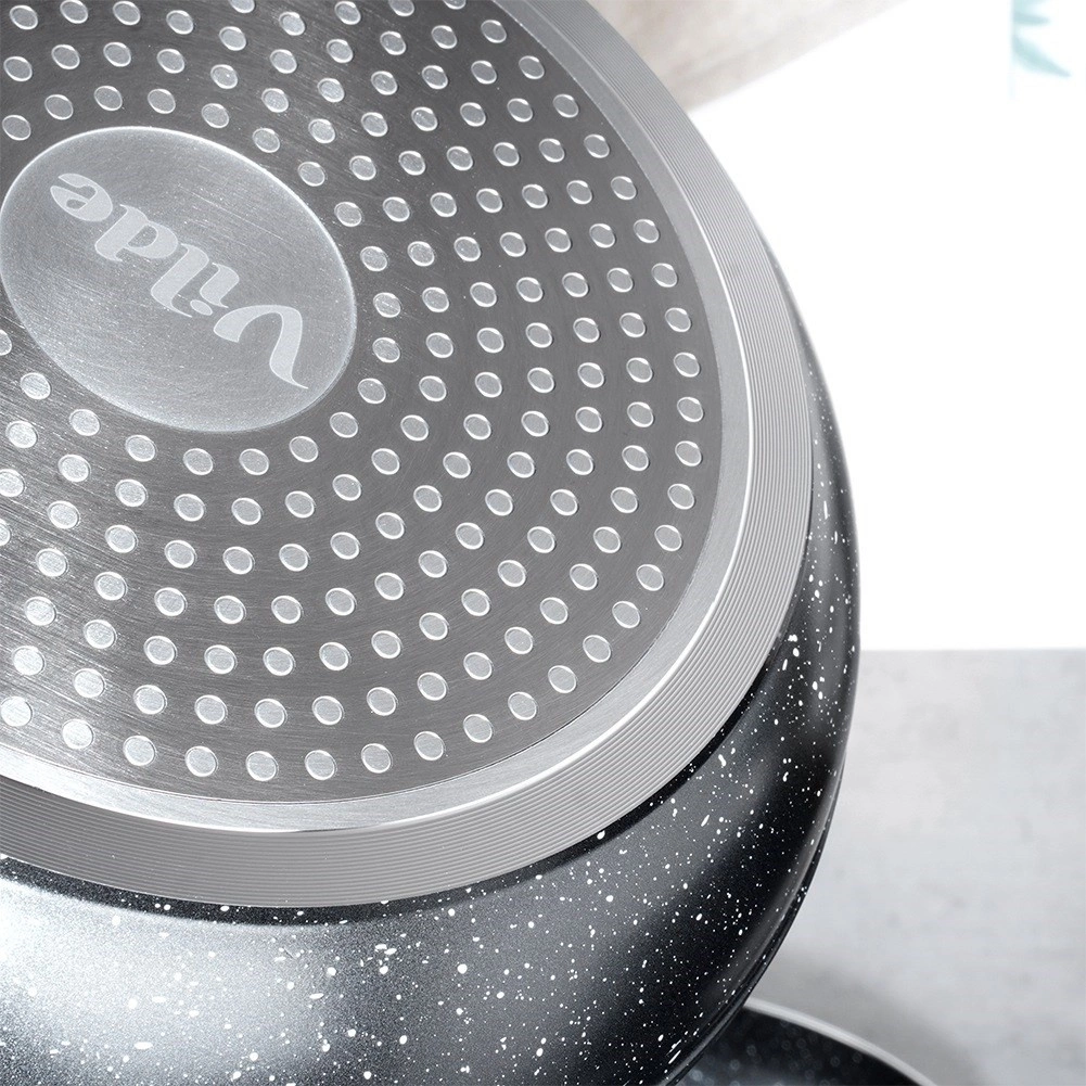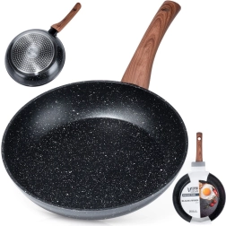 Această tigaie stilată în combinație de negru și decor de lemn oferă încălzire rapidă și distribuție uniformă a căldurii pentru prăjire și înăbușire eficiente. Stratul antiaderent din granit rezistent minimizează lipirea și ușurează curățarea, astfel încât pregătiți ouă, carne și legume cu mai puțin ulei.