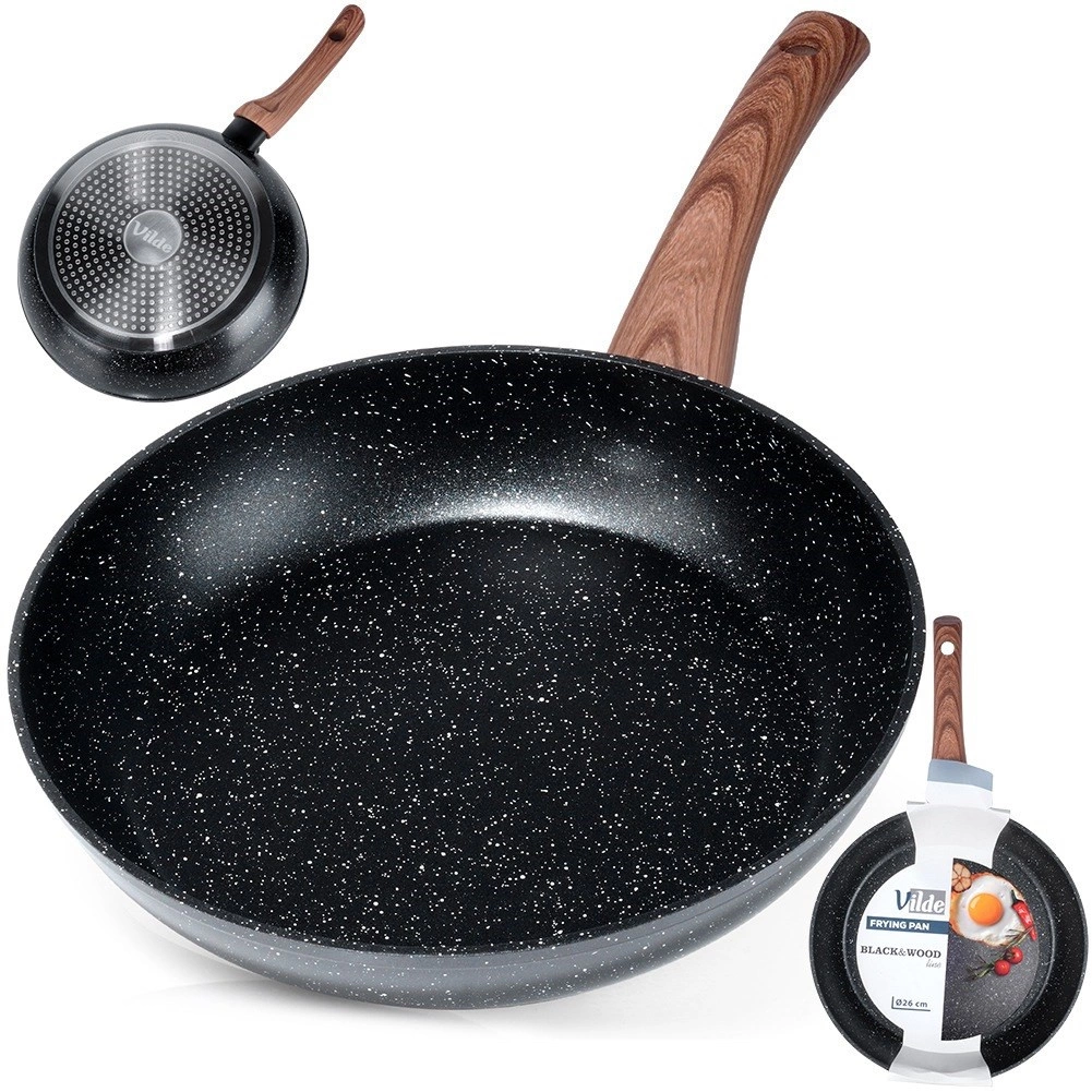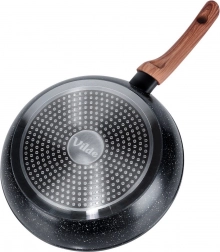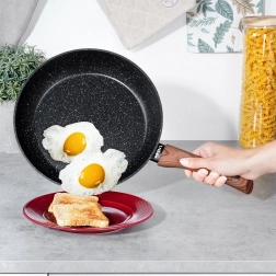 Tigaia îndrăgită, în combinația modernă de negru și lemn, devine un ajutor practic pentru prăjire și înăbușire. Corpul rezistent din aluminiu, cu strat antiaderent de granit de calitate, asigură eliberarea ușoară a preparatelor și o curățare simplă. Ideală pentru carne, legume, ouă și reîncălzirea rapidă a mâncării.