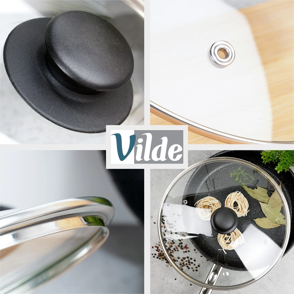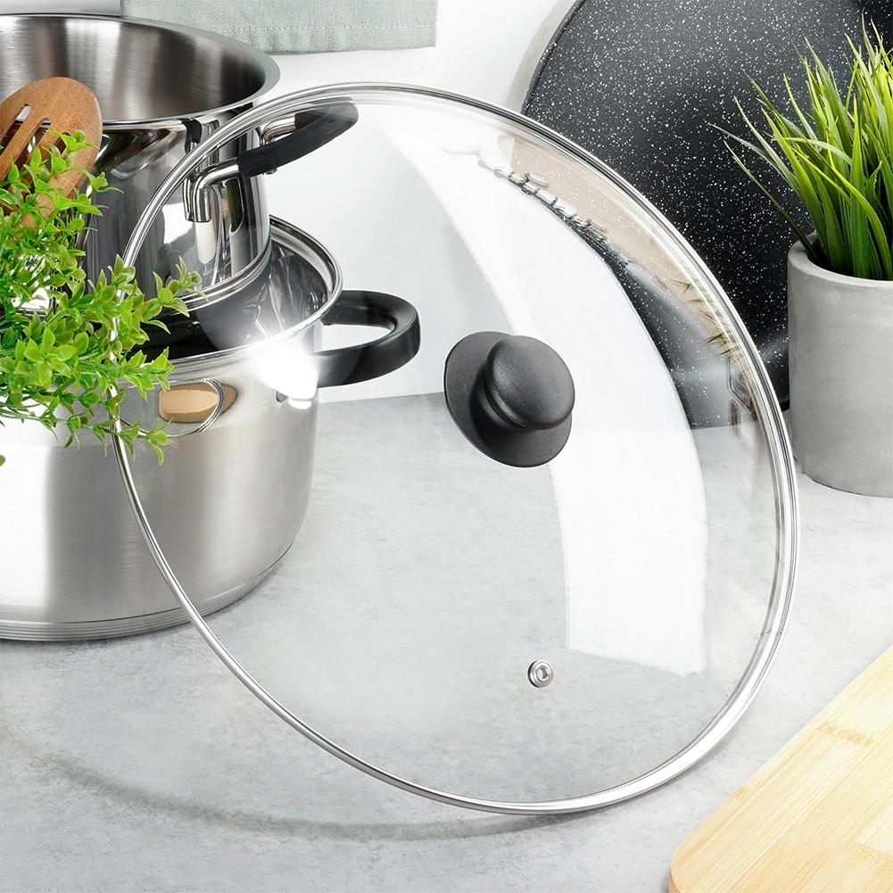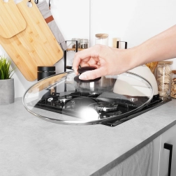 Orificiul de aerisire integrat reglează aburul în exces, iar forma ușor bombată favorizează circulația aerului fierbinte. Butonul negru ergonomic din material rezistent este plăcut la atingere și ușurează manipularea. Capacul este compatibil cu mașina de spălat vase și rezistă la temperaturi de până la +200 °C.
