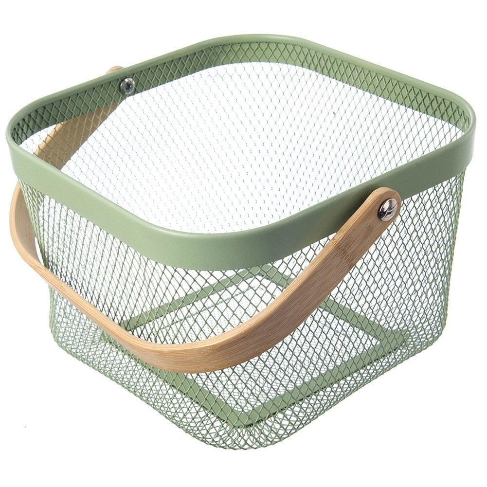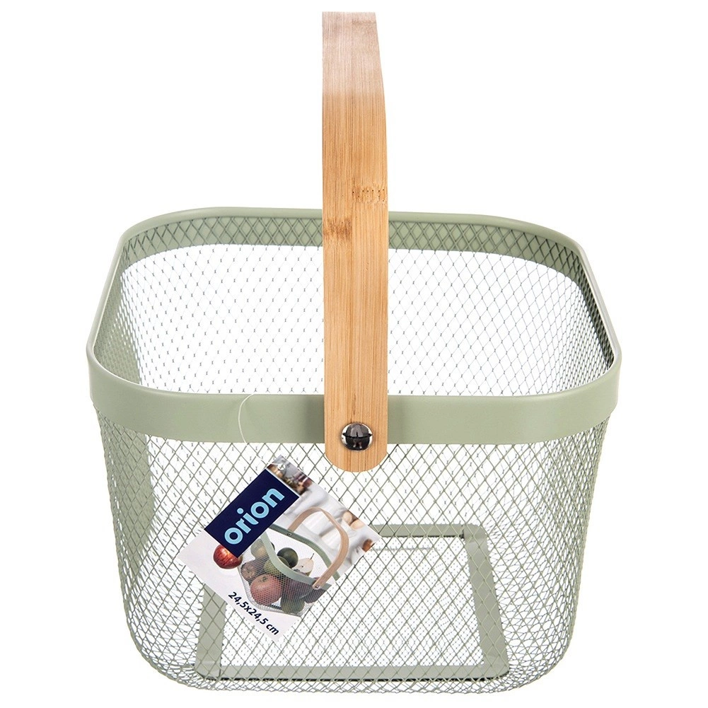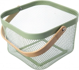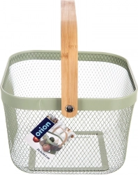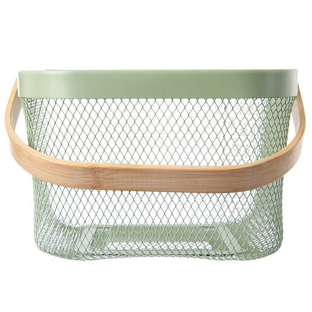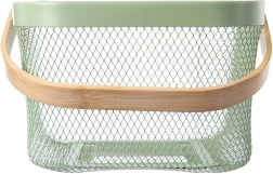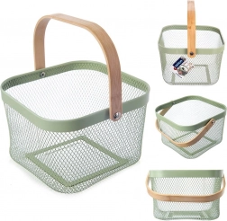 Acest coș de depozitare cu design modern îmbină rezistența metalului și eleganța naturală a mânerului din bambus. Construcția ajurată (din plasă) asigură circulație optimă a aerului, fiind perfectă pentru fructe și legume, precum și pentru cosmetice, prosoape sau accesorii pentru casă.