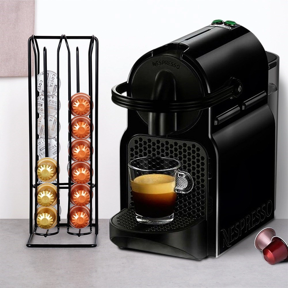 Păstrați ordinea în capsule și aveți mereu la îndemână cafelele preferate. Acest suport stilat din metal negru rezistent găzduiește până la 32 de capsule NESPRESSO și datorită celor patru coloane clare permite reumplerea și preluarea ușoară a capsulelor de jos.