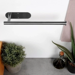Brațul în formă de L permite montarea sub raft sau sub dulap și menține prosoapele mereu la îndemână fără a ocupa blatul de lucru.