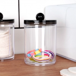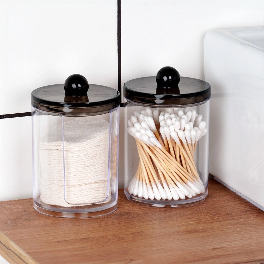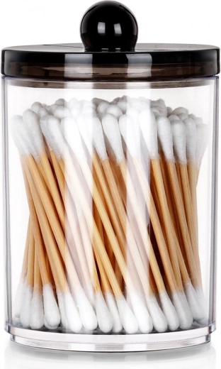 Păstrează-ți ordonate accesoriile cosmetice într-un singur loc. Acest recipient acrilic transparent este ideal pentru bețișoare de urechi sau discuri demachiante. Designul minimalist cu capac negru se potrivește oricărei băi moderne și protejează conținutul de praf.