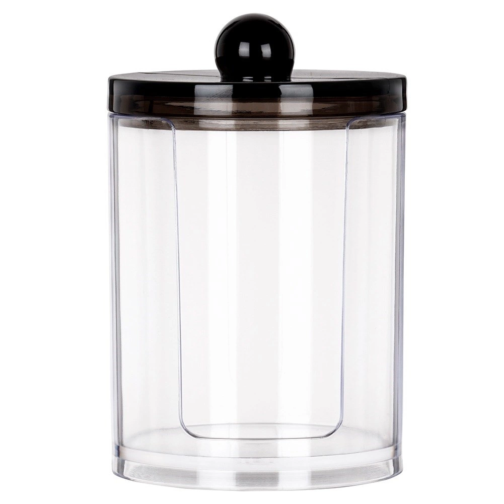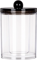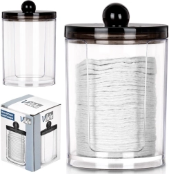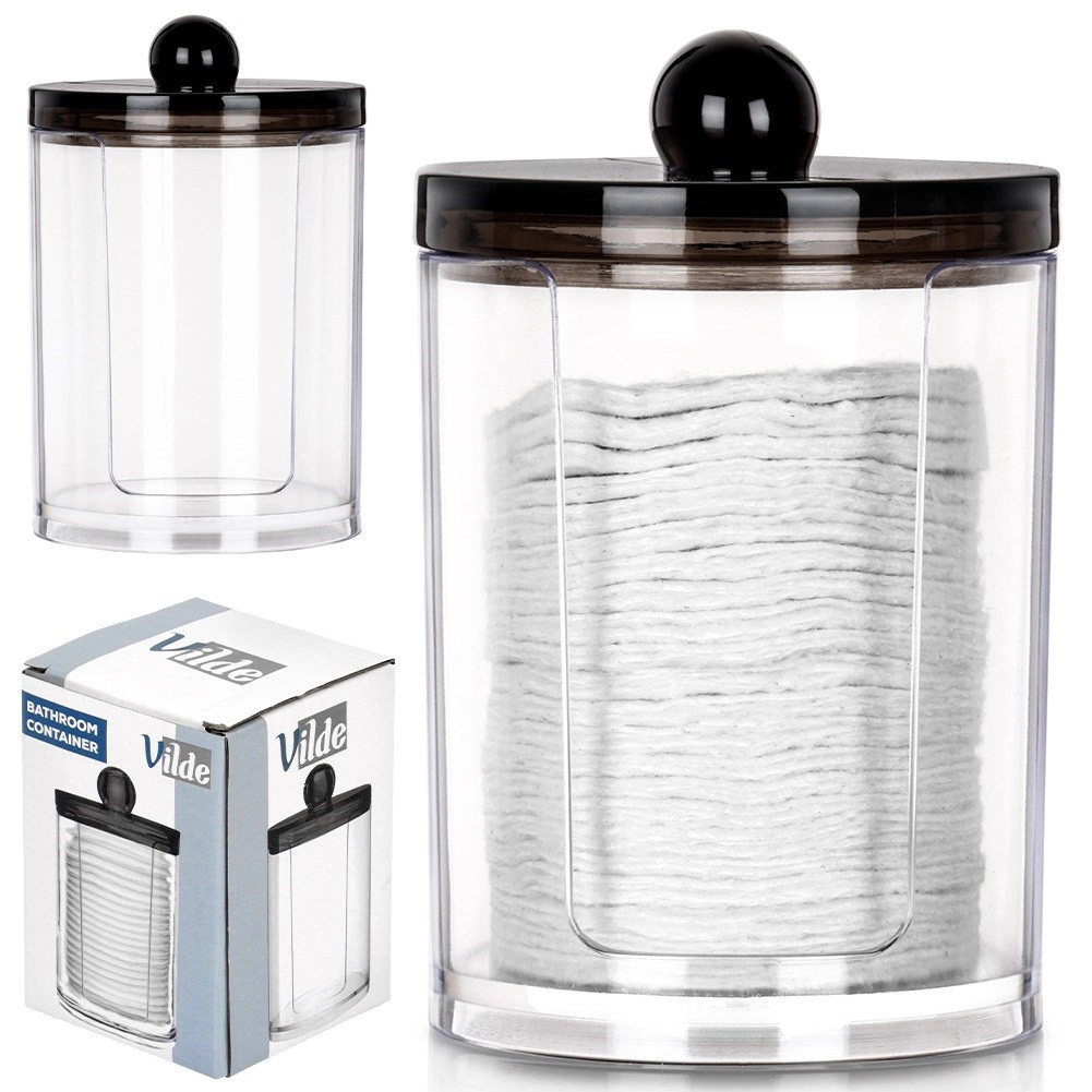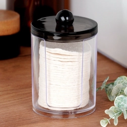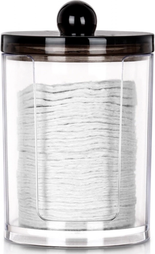 Organizator elegant pentru dischete demachiante din acril transparent de calitate, care oferă control instant asupra stocului, în timp ce capacul solid de culoare neagră, cu knob practic, protejează conținutul de praf și umiditate. Dimensiunea compactă de 7 × 11 cm economisește spațiu pe lavoar sau măsuța de toaletă, oferind totodată un volum suficient pentru utilizarea zilnică.