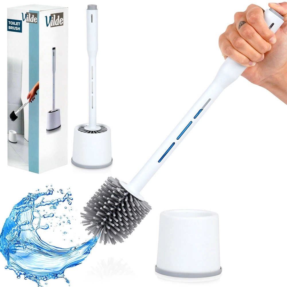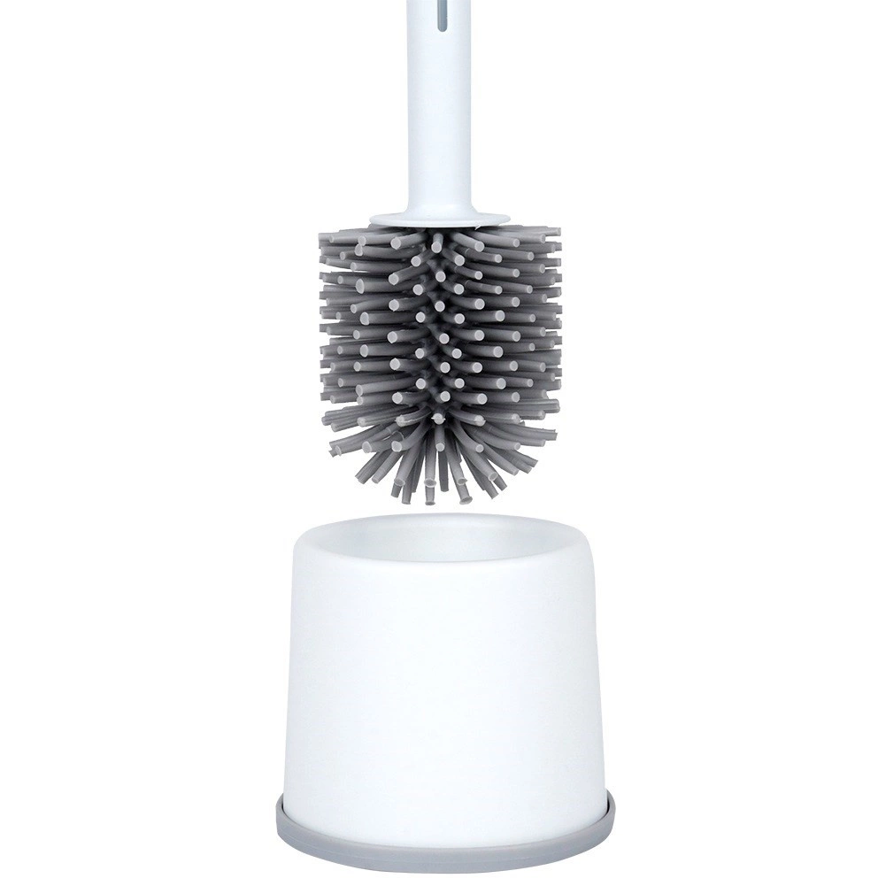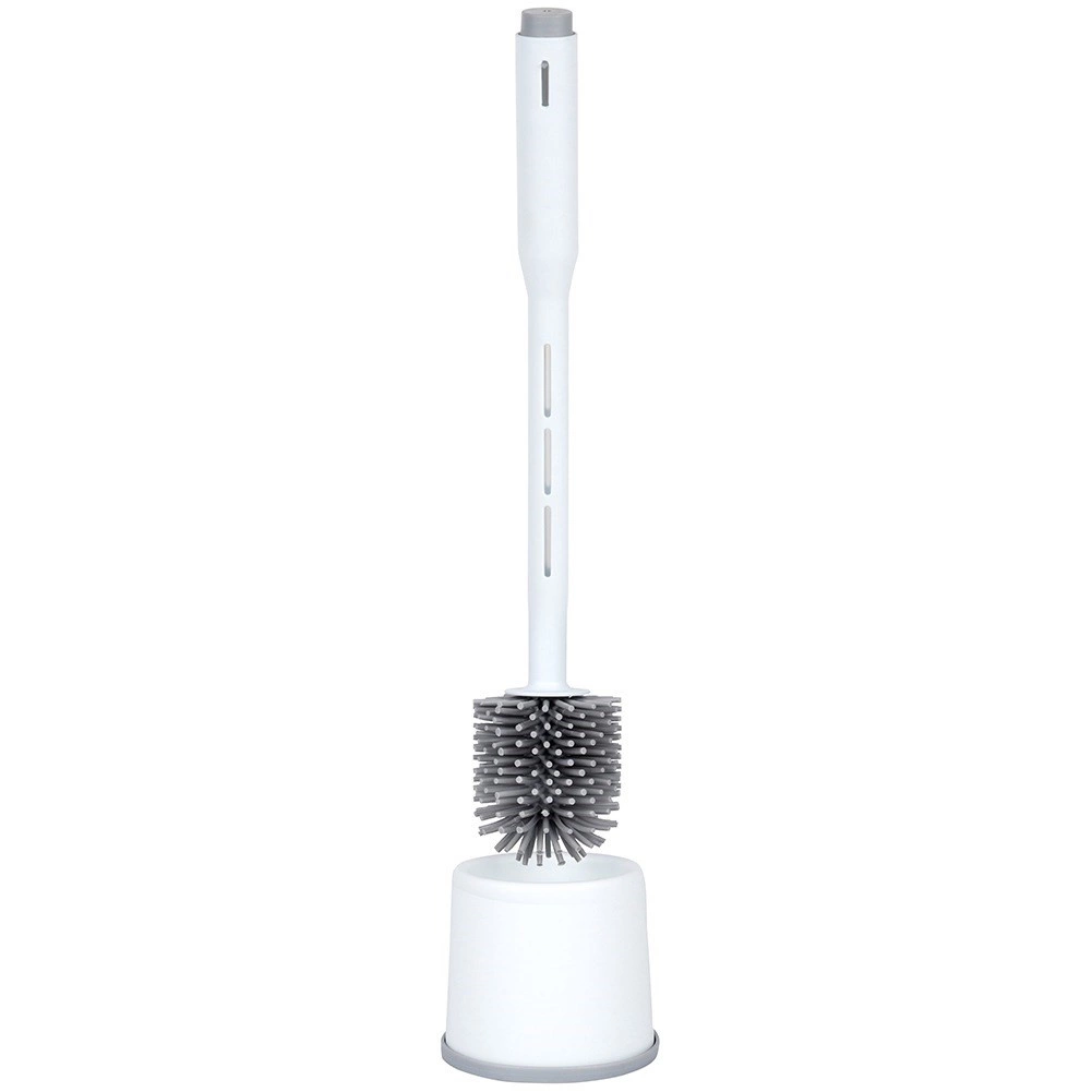 Perii din silicon denși îndepărtează eficient impuritățile și calcarul fără a zgâria suprafața vasului. Stativul ventilat cu bază antiderapantă menține peria în poziție verticală, accelerează uscarea și asigură igiena maximă, precum și un aspect estetic într-o baie mică.