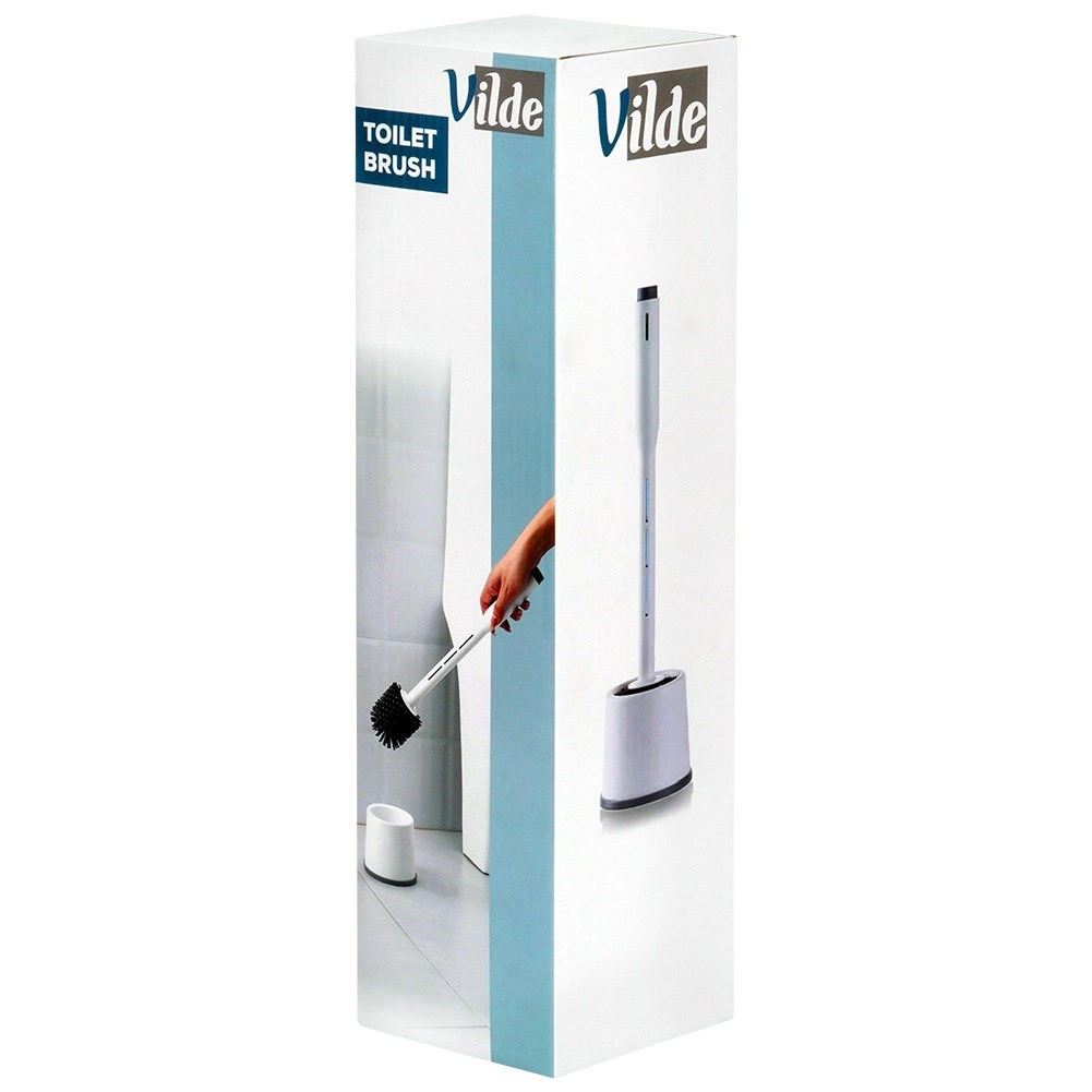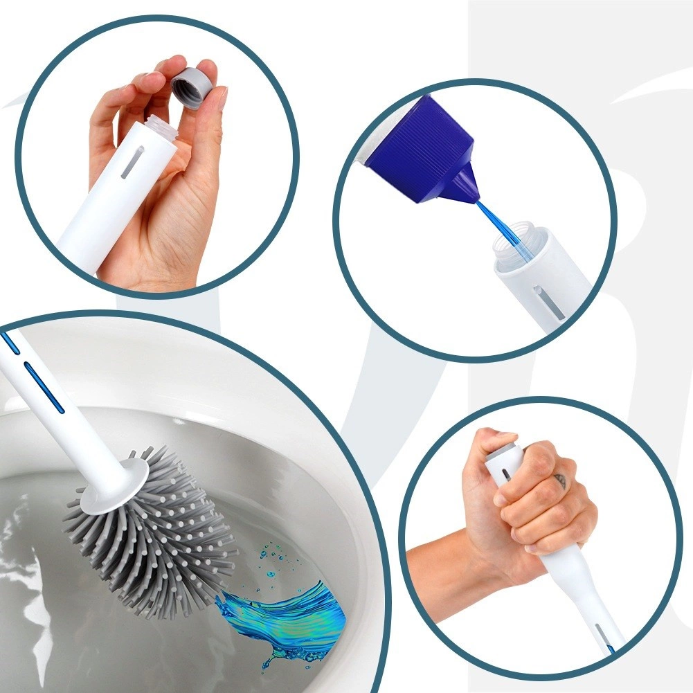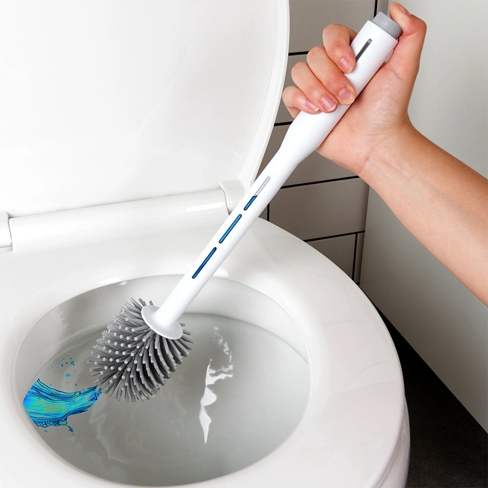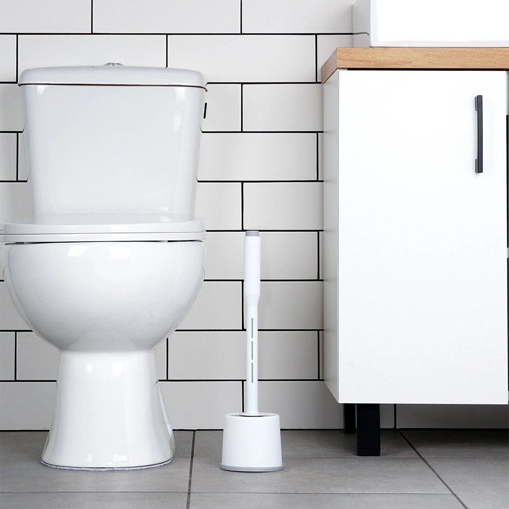 Perii din silicon denși îndepărtează eficient impuritățile și calcarul fără a zgâria suprafața vasului. Stativul ventilat cu bază antiderapantă menține peria în poziție verticală, accelerează uscarea și asigură igiena maximă, precum și un aspect estetic într-o baie mică.