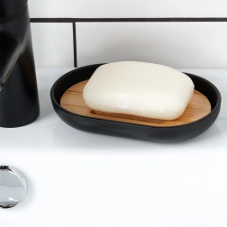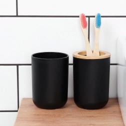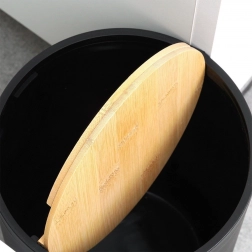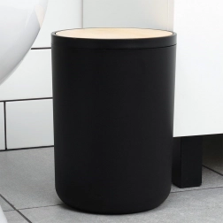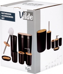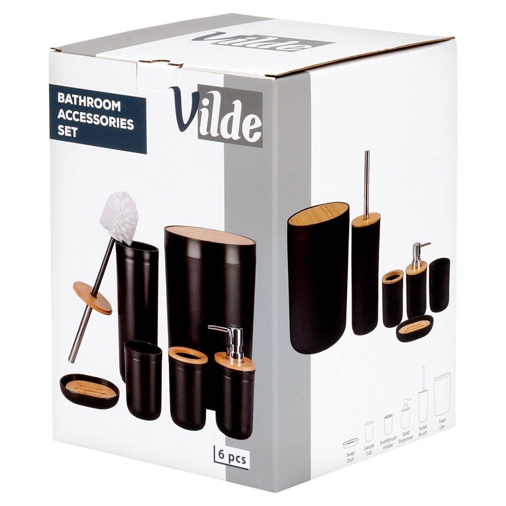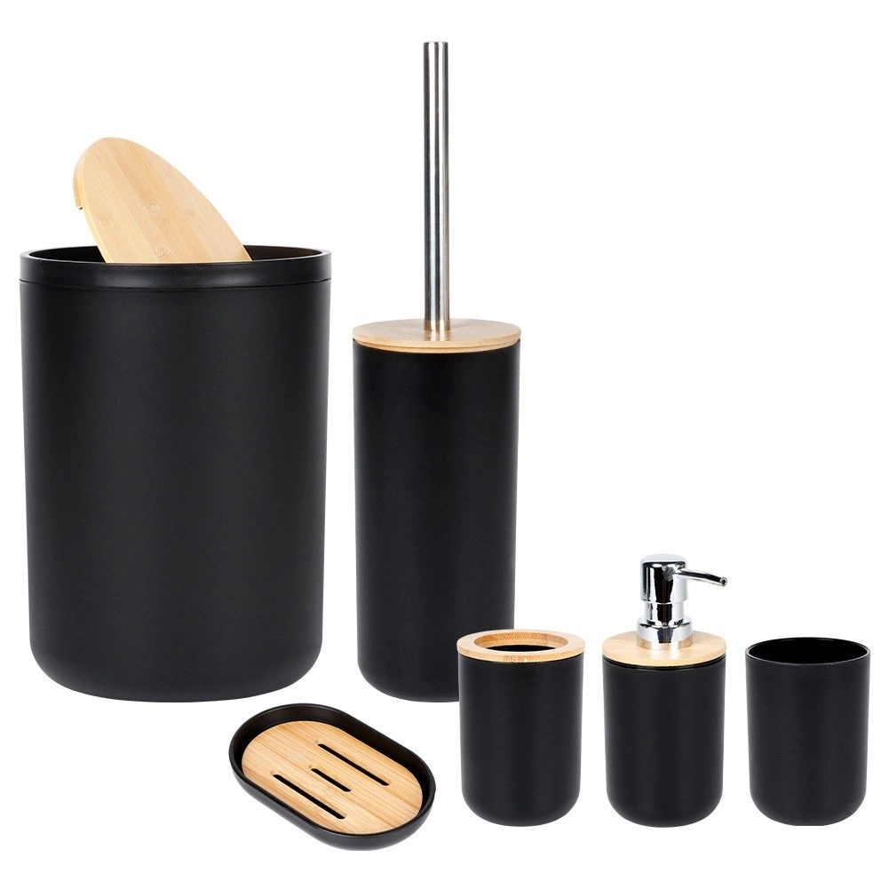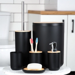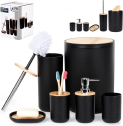 Acest set din 6 piese combină corpul negru mat cu detalii calde din bambus, oferind interiorului un aspect modern și un contrast plăcut. Fiecare piesă este concepută pentru utilizare practică zilnică și curățare ușoară – este suficient să ștergeți cu o cârpă umedă. Peria de WC are cap detașabil prin înșurubare și suport închis pentru depozitare igienică și estetică.