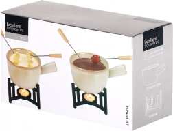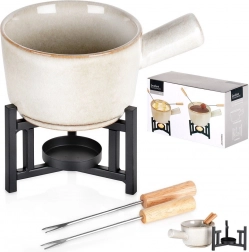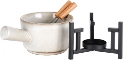 Acest set compact pentru fondue combină porțelan de calitate într-o nuanță fină de bej cu un suport metalic durabil în negru mat. Bolul se încălzește rapid și menține temperatura pentru mult timp, astfel încât vă puteți bucura de ciocolată topită, brânză și alte dipuri calde exact așa cum vă plac.