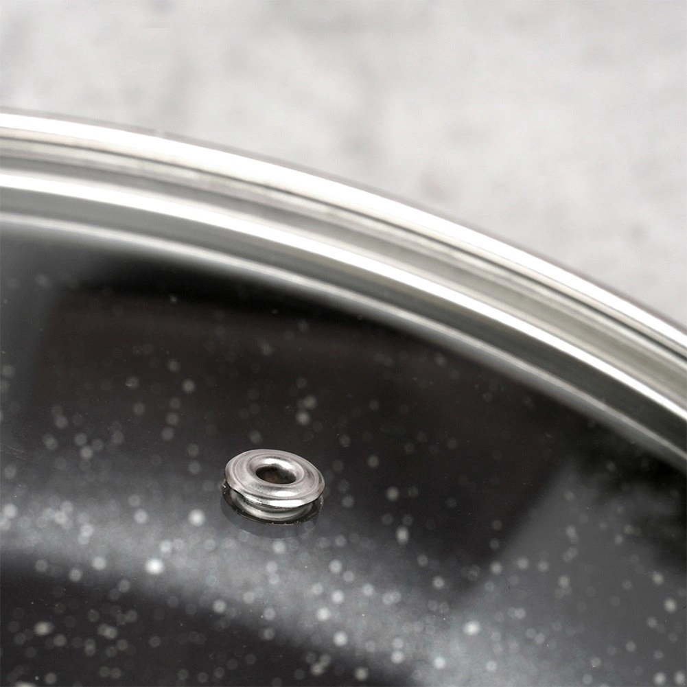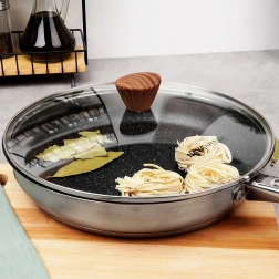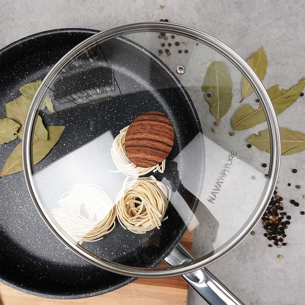 Datorită sticlei transparente, urmăriți ușor preparatul fără pierderi inutile de căldură. Orificiul de aerisire eliberează aburul, capacul este ușor bombat pentru o mai bună circulație a aerului fierbinte, iar marginea înaltă asigură fixare fermă și etanșă. Capacul grăbește gătirea, menține temperatura și minimizează stropirea.
