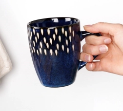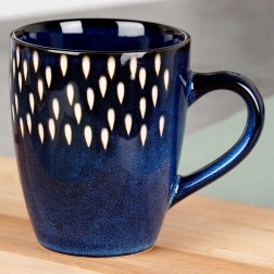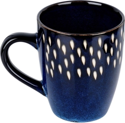 Cană elegantă din ceramică cu capacitatea de 350 ml, în culoare albastru închis, cu decor alb cu picături. Datorită mânerului ergonomic se ține bine în mână, este potrivită pentru mașina de spălat vase și pentru cuptorul cu microunde și este ideală pentru cafea, ceai sau cacao.