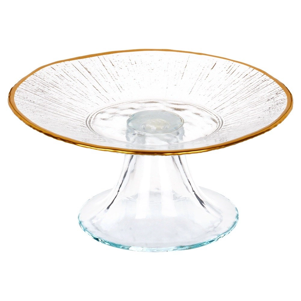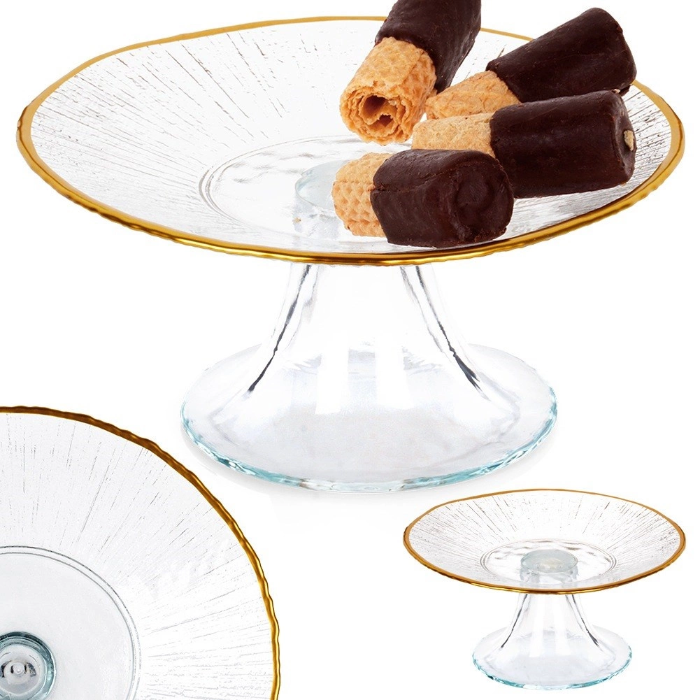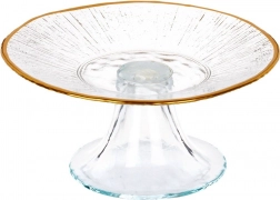 Această pateră compactă din sticlă, cu diametrul de 15,5 cm și înălțimea de 7 cm, este alegerea perfectă pentru servirea porțiilor mai mici – mini torturi, cupcakes, biscuiți sau gustări sărate. Sticla transparentă cu o textură fină, ce amintește de cristal, scoate în evidență culorile și texturile preparatelor, în timp ce marginea aurie adaugă o notă luxoasă.