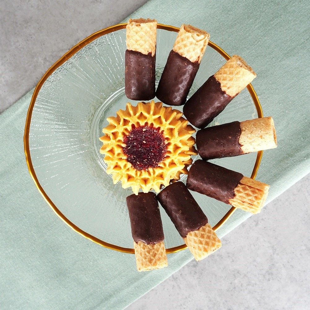Marginea aurie și efectul cristal al sticlei adaugă eleganță mesei și evidențiază deserturile servite.