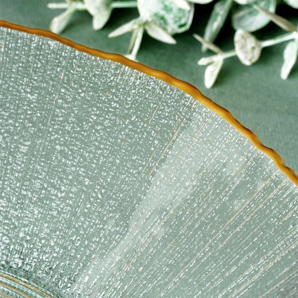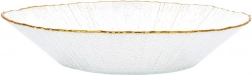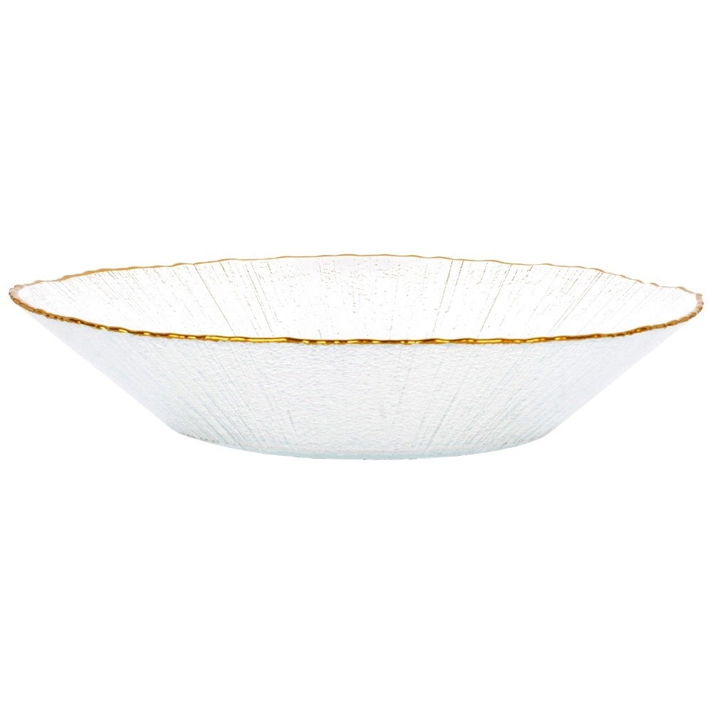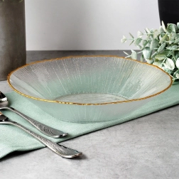 Acest bol stilat din sticlă transparentă, cu margine aurie decorativă, se remarcă prin forma modernă și valul neregulat care amintește de cristalul șlefuit. Este perfect pentru utilizarea zilnică și mesele festive – de la salate de legume și fructe până la snacks-uri, popcorn sau porții mici de paste.