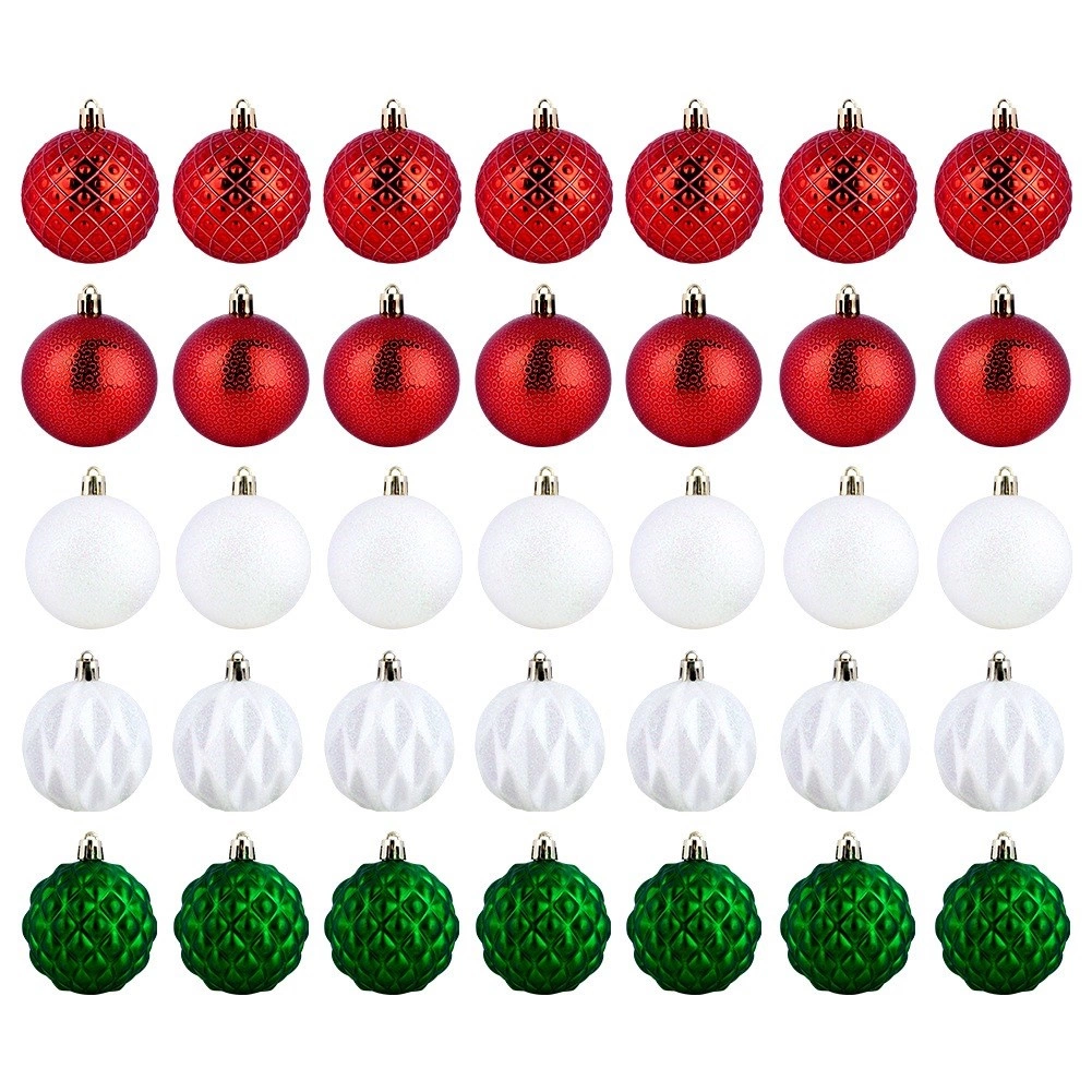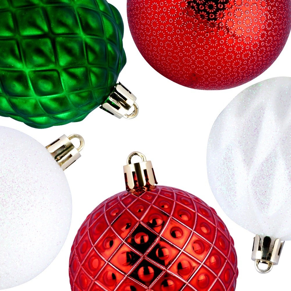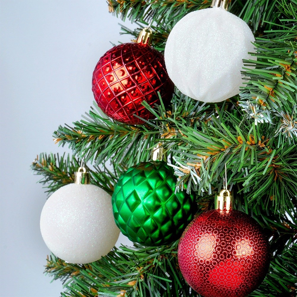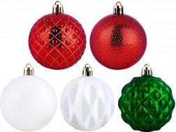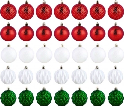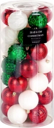 Pachetul practic conține 35 de globuri cu diametrul de 6 cm în culorile roșu, verde și alb, inclusiv șnururi pentru agățare, pentru o decorare rapidă și ușoară.