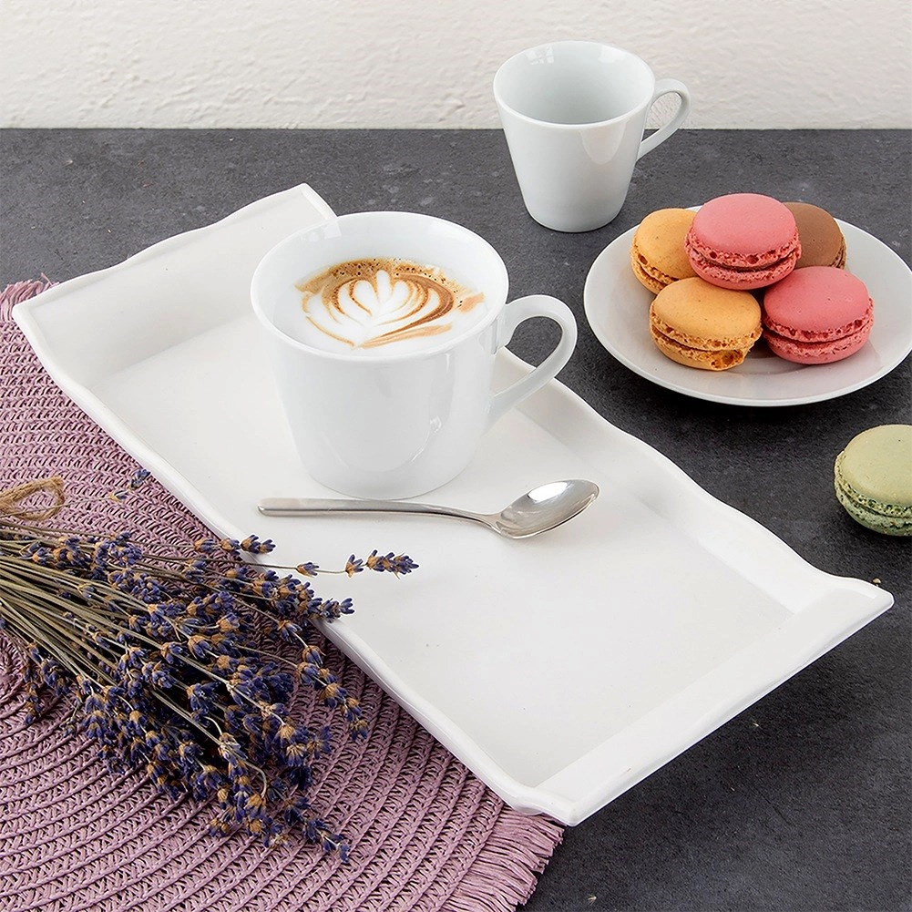 Tava de servire elegantă, în variantă albă, facilitează transportul cafelei, ceaiului, deserturilor și gustărilor. Marginile ondulate mai înalte și priza comodă ajută la prevenirea alunecării nedorite și a vărsării. Perfectă pentru utilizare zilnică și ocazii festive.