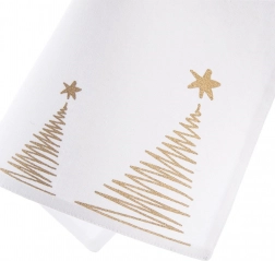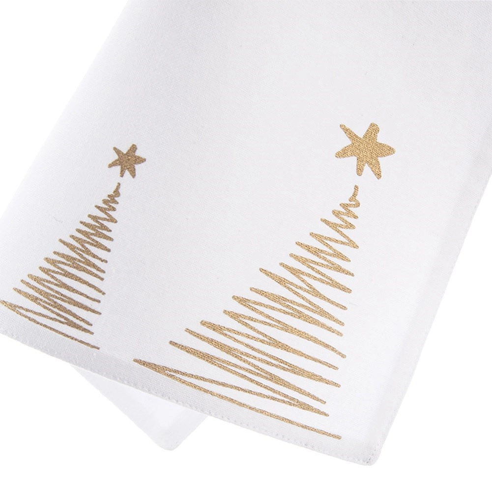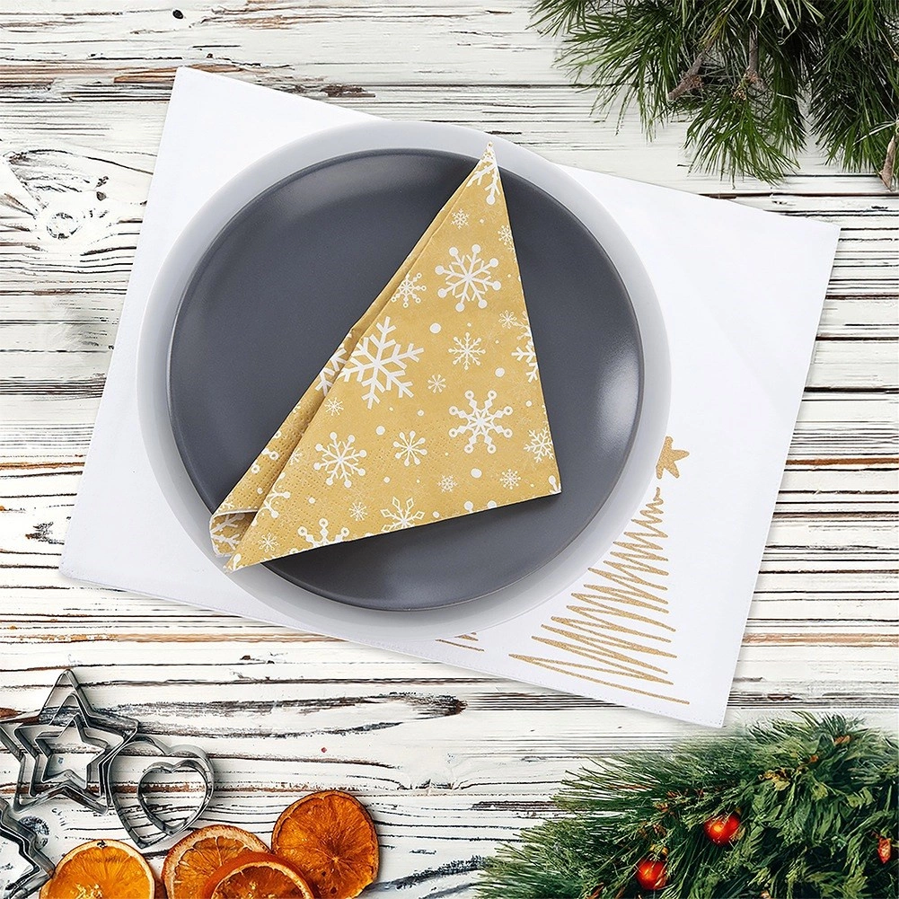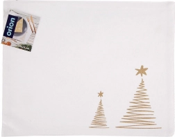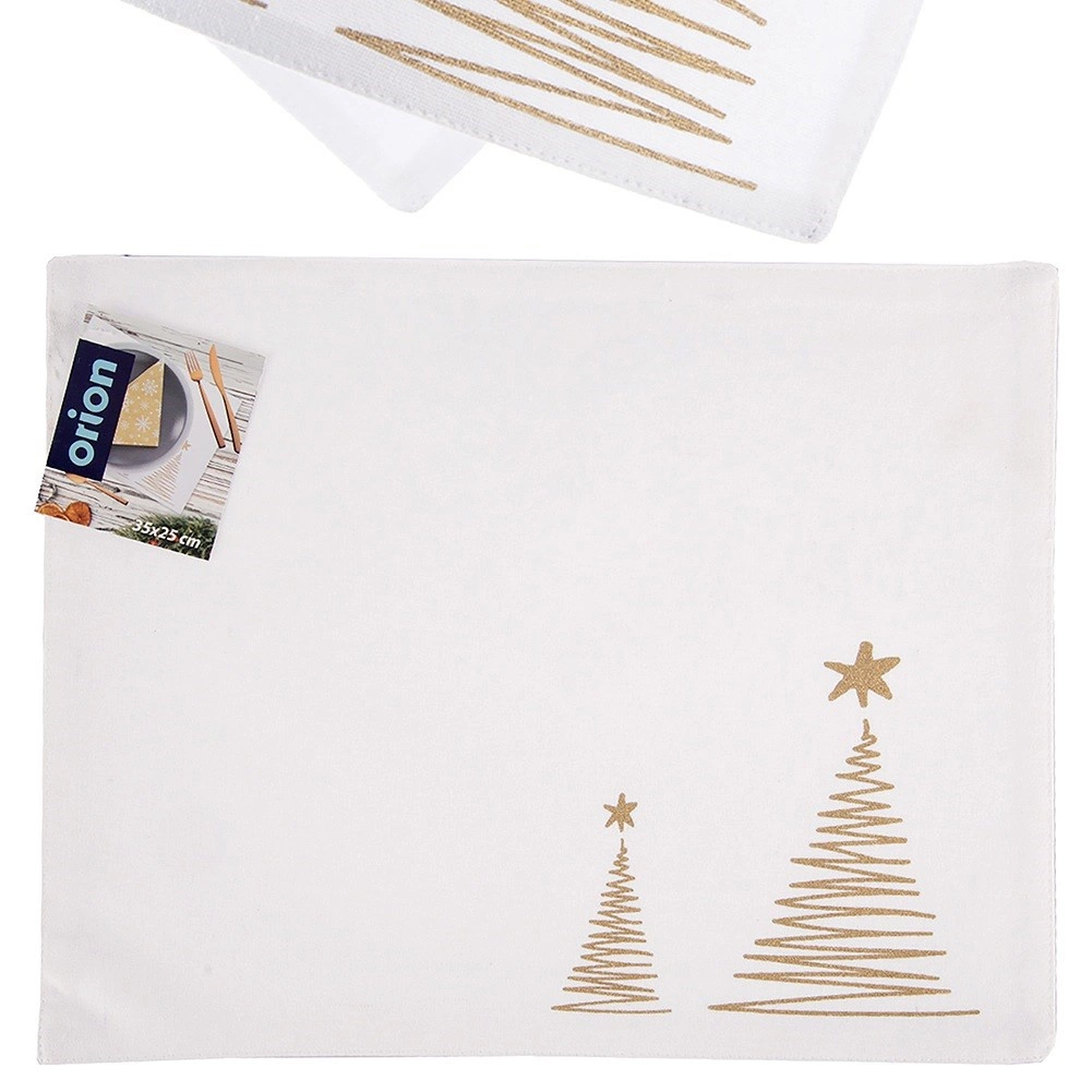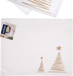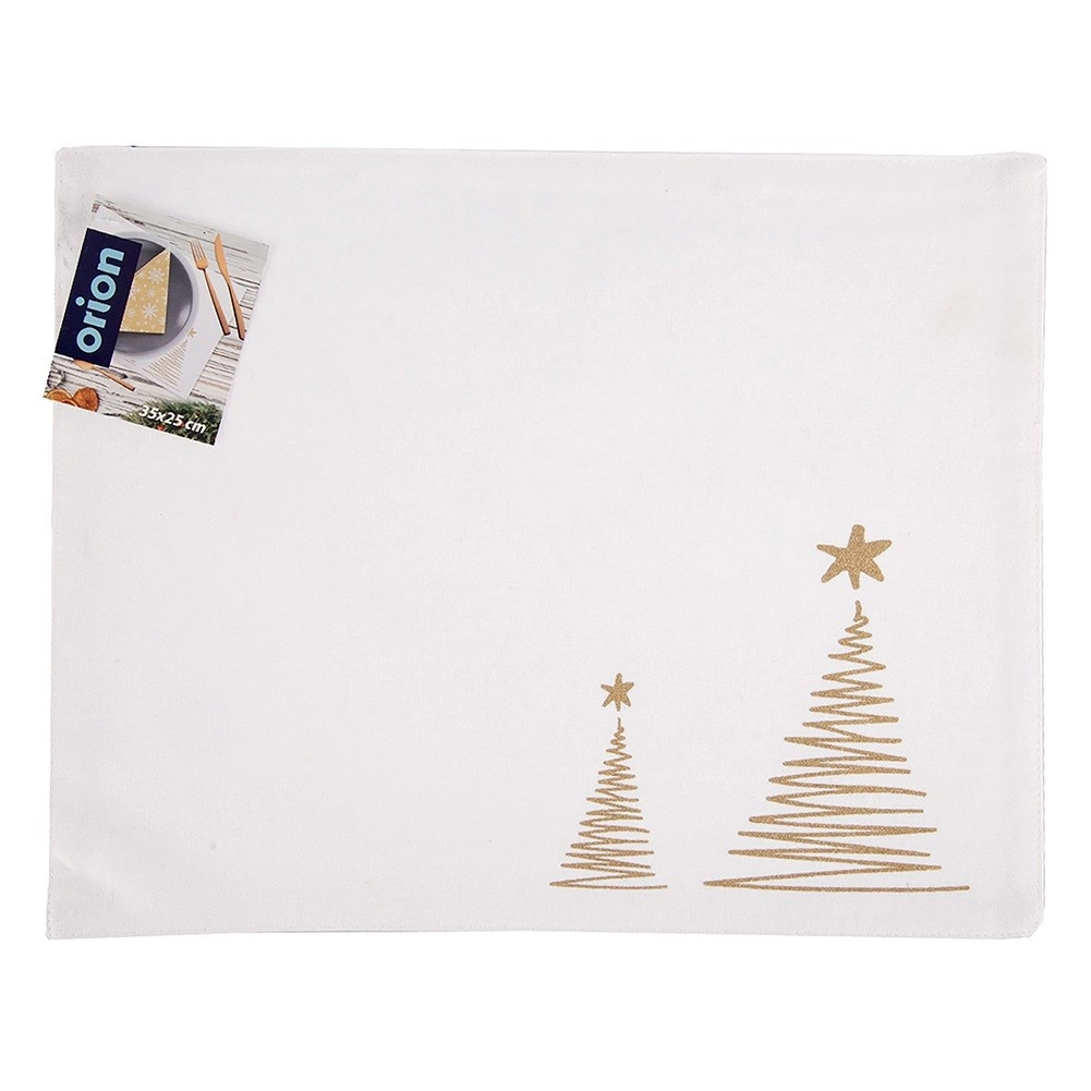 Acest suport de masă din bumbac transformă orice masă festivă sau de zi cu zi. Fundalul alb cu motiv auriu de brăduți de Crăciun creează un cadru armonios și elegant pentru servire. Datorită dimensiunilor de 33,5 × 26 cm este perfect pentru farfurii, cești și farfurioare de desert, oferind mesei un aspect unitar.