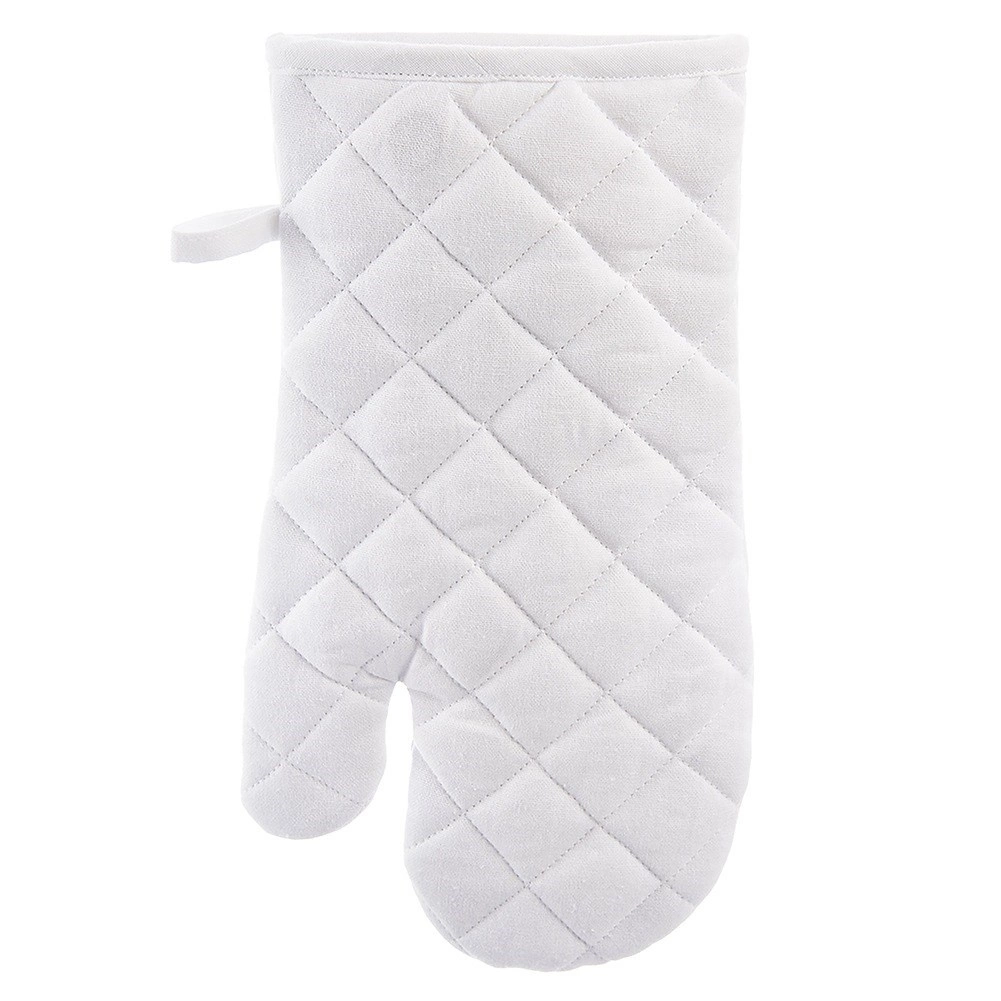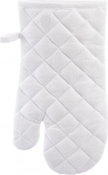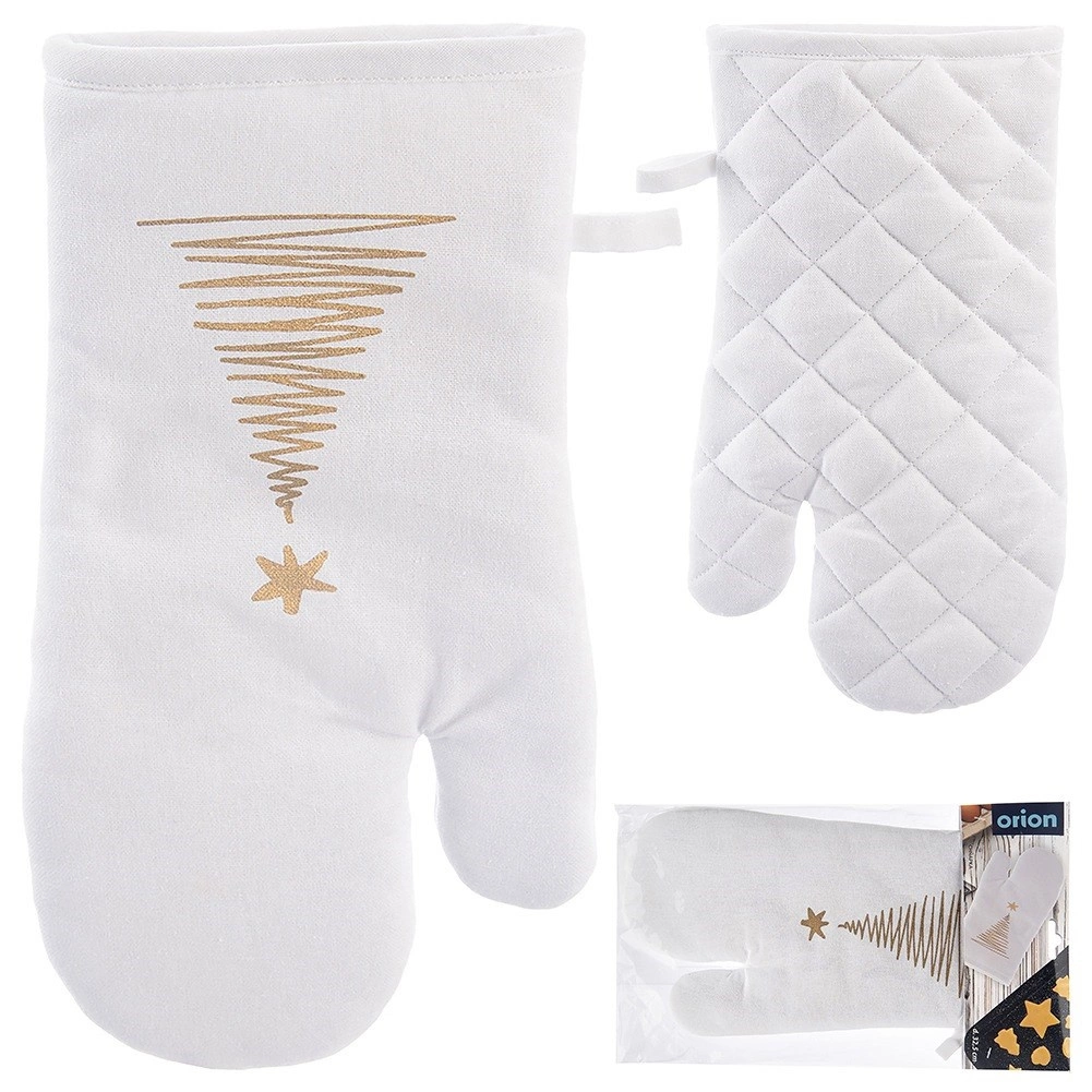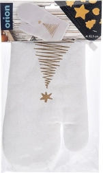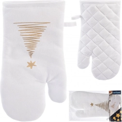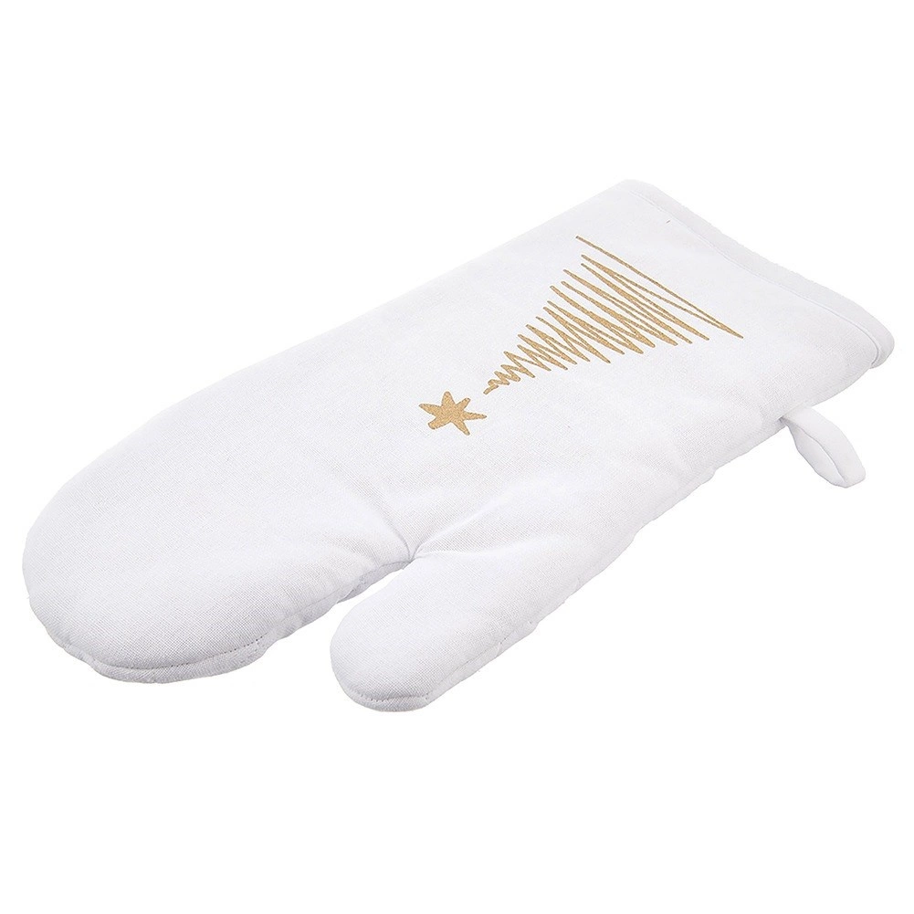 Mănușa practică și elegantă în culoare albă, cu motiv auriu de brăduț, va deveni un ajutor indispensabil în orice bucătărie. Construcția de calitate din bumbac, cu căptușeală moale, asigură izolație termică eficientă și o prindere sigură a tavilor și oalelor fierbinți.