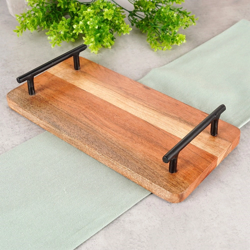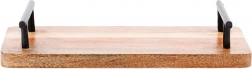 Descoperiți un accesoriu practic și decorativ pentru bucătăria și sala dvs. de mese. Această tavă dreptunghiulară din lemn de salcâm cu mânere metalice robuste asigură transportul sigur al cafelei, ceaiului, deserturilor și preparatelor mici. Fibra naturală a lemnului și aspectul loft adaugă eleganță mesei.