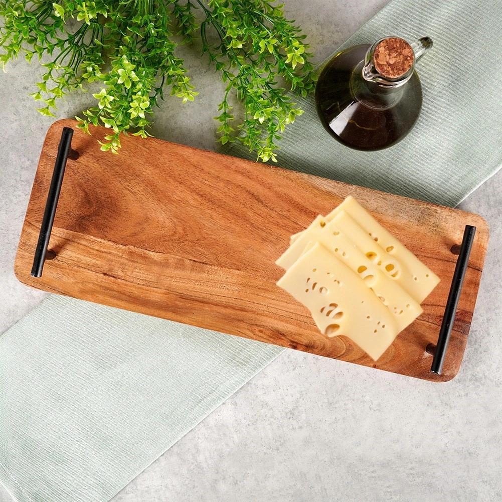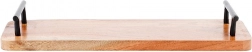 Acest toc dreptunghiular de servire din lemn de salcâm îmbină funcționalitatea cu un aspect modern de loft. Două mânere metalice rezistente în culoare neagră asigură o prindere stabilă și transport confortabil al băuturilor și preparatelor. Suprafața netedă din lemn este potrivită pentru servirea directă a gustărilor și se curăță ușor.