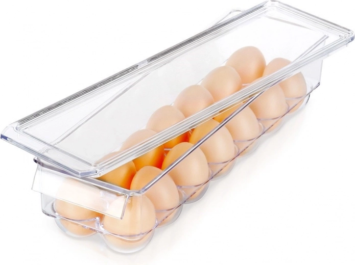 Acest recipient rezistent și reutilizabil pentru ouă este conceput pentru depozitarea sigură și igienică a până la 14 ouă în frigider. Designul transparent oferă o privire rapidă asupra cantității, capacul protejează conținutul și permite menținerea unui mediu curat și organizat în frigider.