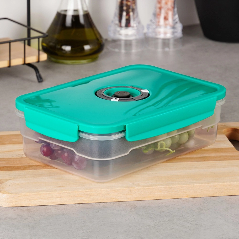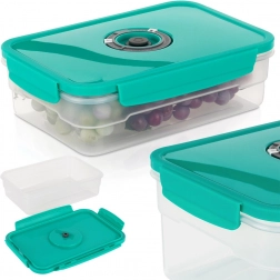 Cutia vidată de 1,2 l este ideală pentru depozitarea fructelor, legumelor, resturilor de mâncare și gustărilor. Valva specială din capac permite evacuarea ușoară a aerului cu ajutorul unei pompe manuale și astfel prelungește prospețimea și gustul alimentelor depozitate. Corpul transparent facilitează verificarea conținutului, iar forma compactă economisește spațiu în frigider.