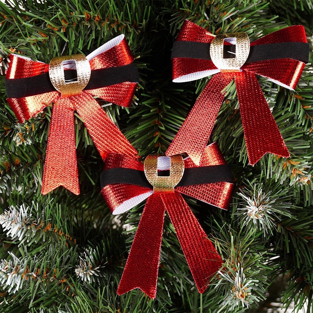 Bucle roșii satinate, cu bandă neagră și detaliu „tip cataramă” auriu, creează efectul curelei lui Moș Crăciun – un accent stilat pentru brad și interior.