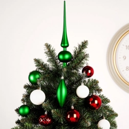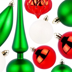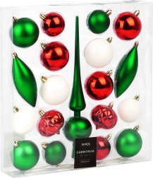 În pachet găsiți un vârf în culoare verde mat, picături elegante și un mix de globuri în nuanțe festive populare. Ornamentele au ochiuri și șnururi practice pentru agățare rapidă.
