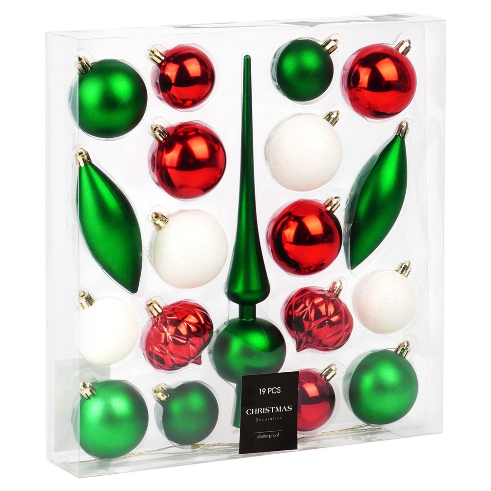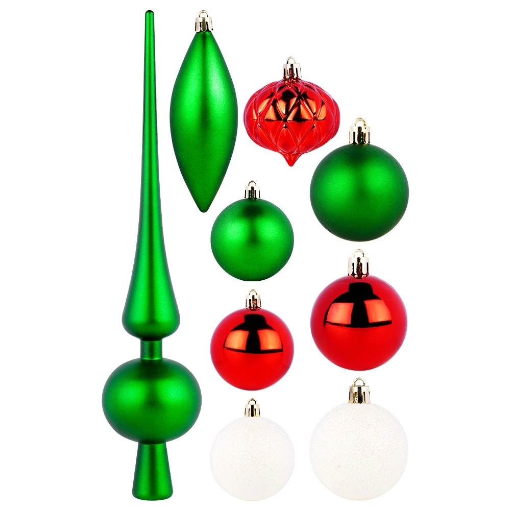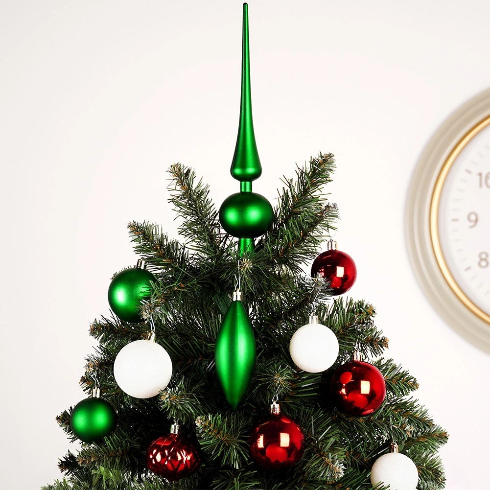 Setul include un vârf înalt, globuri rotunde și două picături pentru un aspect echilibrat și festiv al bradului.