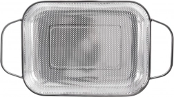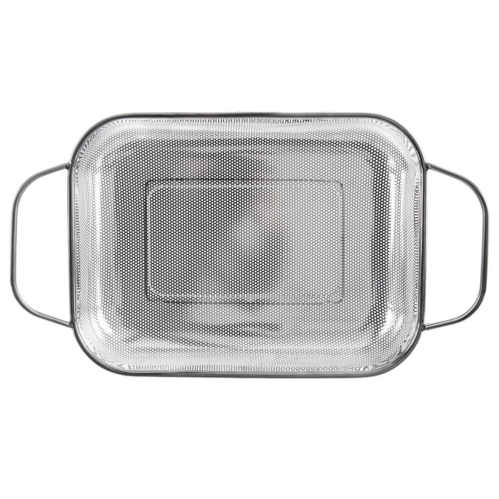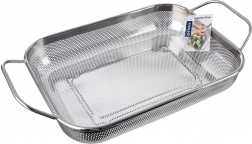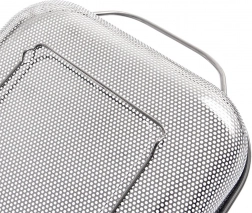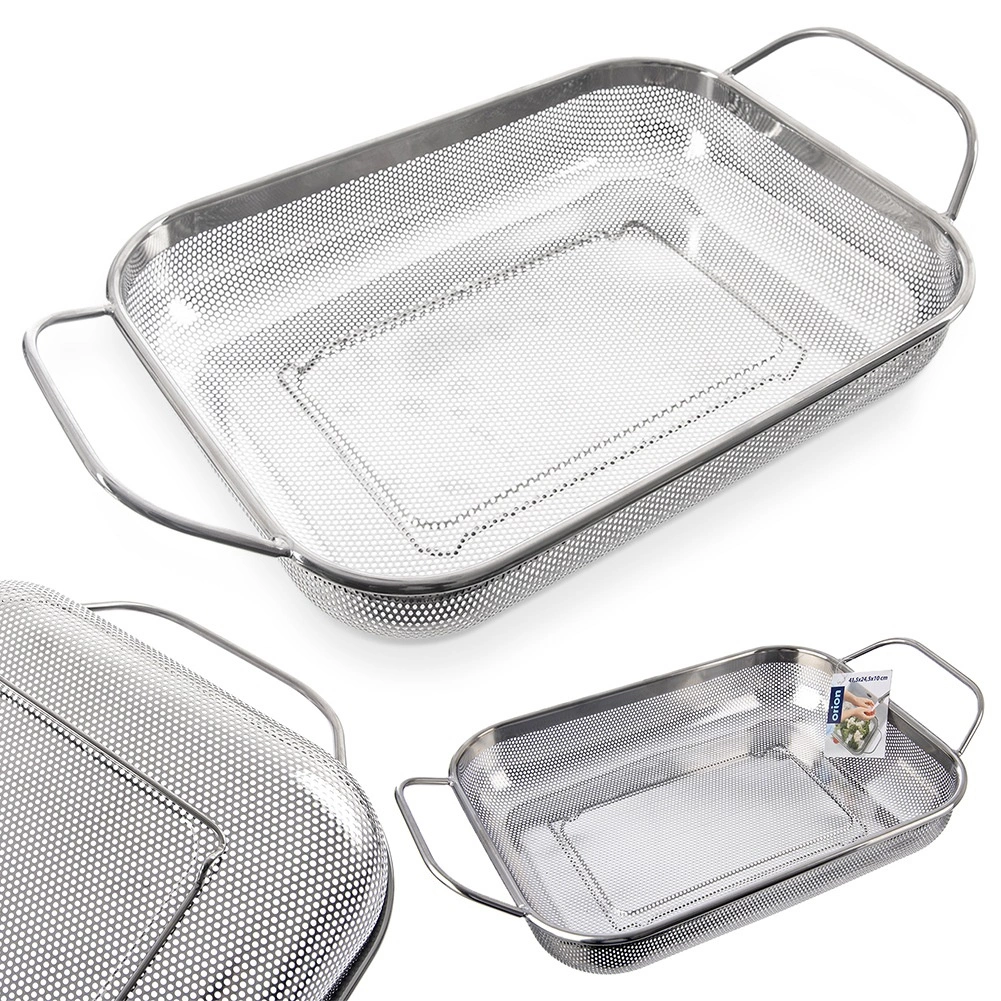 Coș dreptunghiular practic din oțel inoxidabil, tip sită/coș de scurgere, cu picioare stabile și două mânere pentru transport facil. Ideal pentru spălarea fructelor și legumelor, strecurarea pastelor sau a orezului și, de asemenea, ca coș pentru grătar pentru legume, pește sau bucăți mai mici de carne. Datorită perforației fine, evacuează rapid apa, este rezistent la temperaturi înalte și poate fi spălat în mașina de spălat vase.