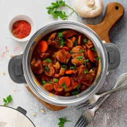 Îl veți folosi pentru supe calde, sosuri, gulașuri și pentru deserturi reci sau înghețată în zilele de vară. Pentru o menținere mai bună a temperaturii, preîncălziți interiorul cu apă fierbinte (1–2 minute) sau răciți-l în frigider aproximativ o oră înainte de utilizare. Suprafața interioară netedă se curăță ușor și facilitează igiena.