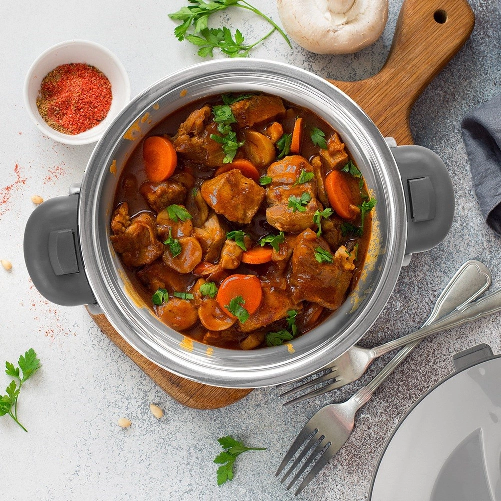 Păstrați supele, felurile principale și deserturile la temperatura ideală datorită robusteții bolului termic din inox de 2 l. Interiorul din oțel inoxidabil se curăță ușor, exteriorul din plastic rezistent protejează împotriva arsurilor și oferă o prindere confortabilă. Capacul se închide printr-o rotire ușoară, iar mânerele laterale asigură un transport sigur.