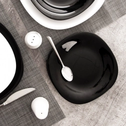 Farfurie de desert LUNA, dimensiuni 20,5 × 20,5 cm, în culoare neagră modernă, din sticlă opal. Datorită formei pătrate cu colțuri rotunjite, marginii ușor înălțate și suprafeței lucioase, este ideală pentru servirea deserturilor, prăjiturilor și gustărilor. Potrivită pentru mașina de spălat vase și cuptorul cu microunde, se potrivește perfect atât pentru uz zilnic, cât și pentru mese festive.