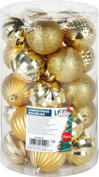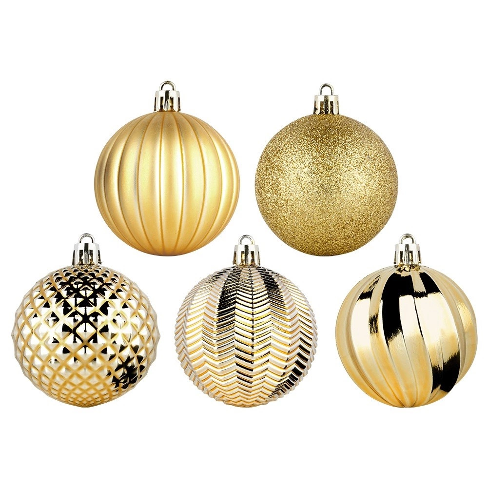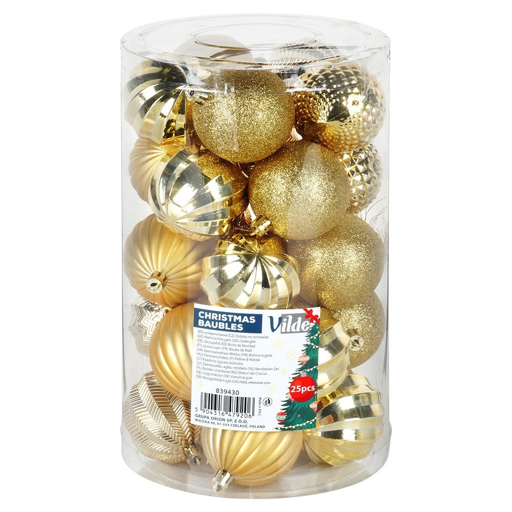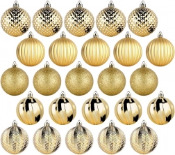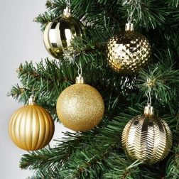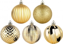 Cu acest set, creați în câteva clipe un decor festiv armonios. Auriul în diverse texturi oferă bradului și interiorului strălucire luxoasă și profunzime, iar execuția durabilă din plastic de calitate asigură o durată de viață îndelungată fără risc de spargere.