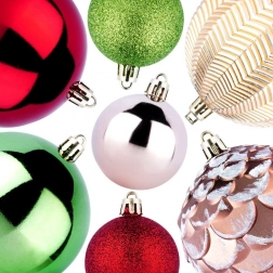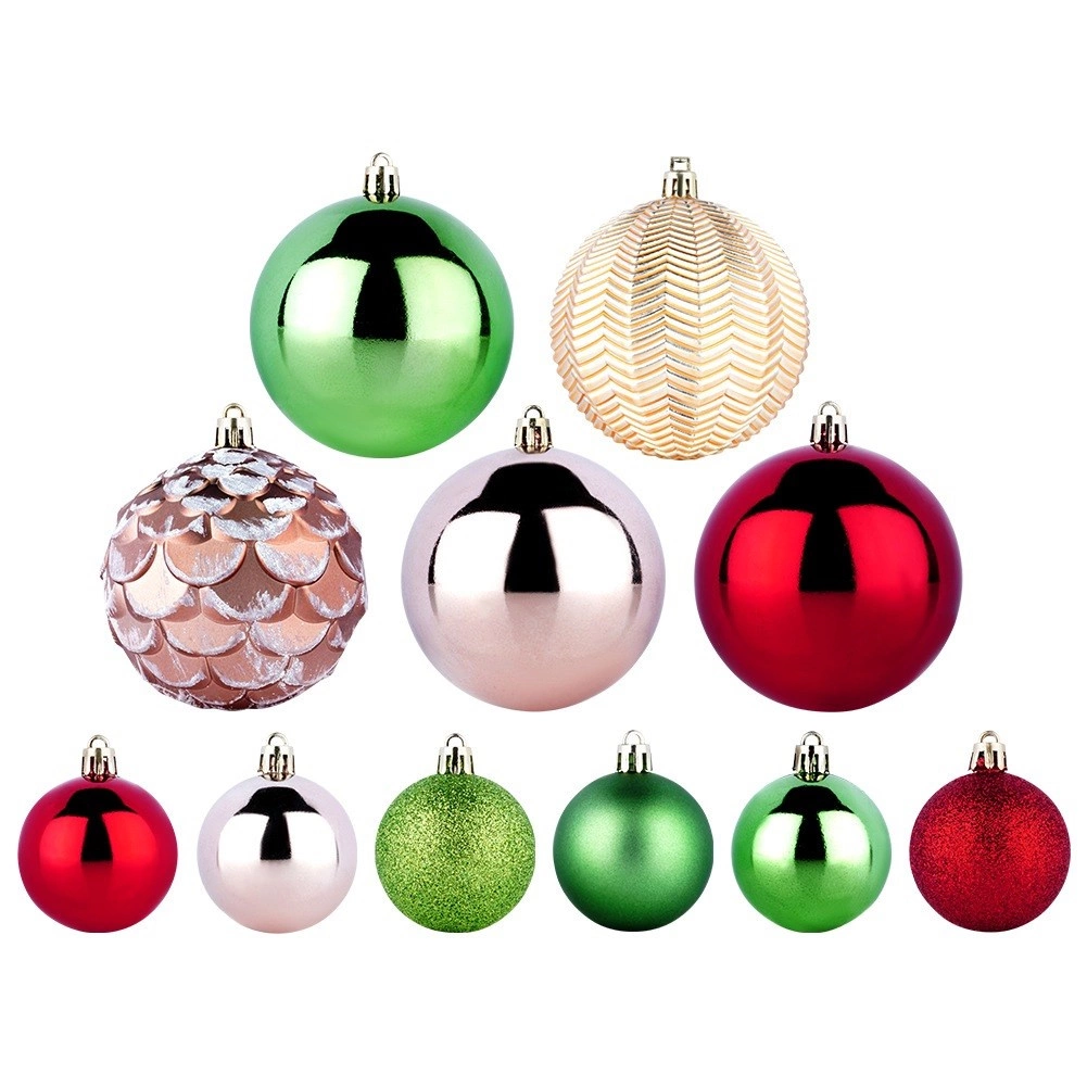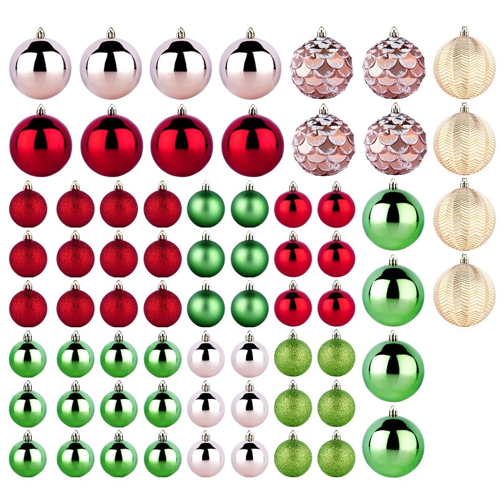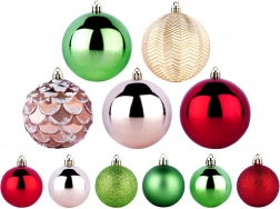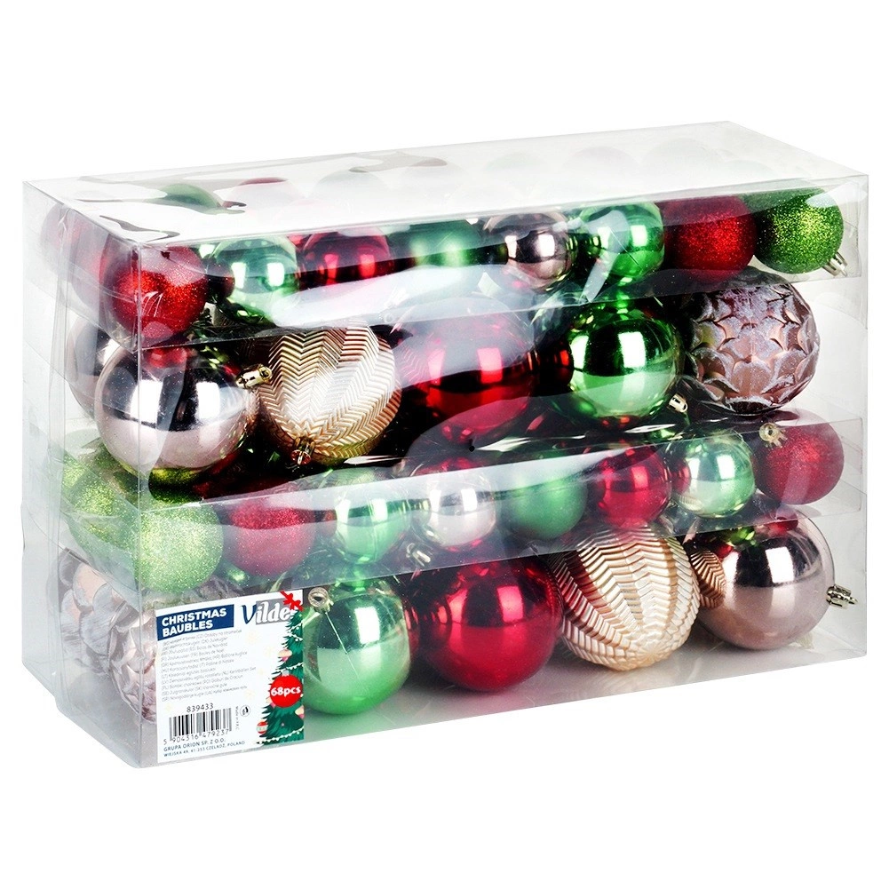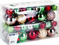 În pachet găsiți 20 de globuri cu diametrul de 8 cm (roșii lucioase, aurii reliefate, roz deschis lucioase și reliefate, verzi lucioase) și 48 de globuri cu diametrul de 5 cm (roșii lucioase 6×, verzi sclipitoare 6×, roz deschis lucioase 6×, roșii sclipitoare 12×, verzi lucioase 12×, verzi mate 6×). Fiecare ornament are un inel metalic, iar în pachet sunt incluse șnururi pentru decorare imediată.