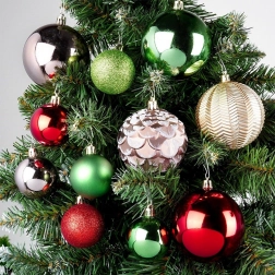 Combinația de globuri de 8 cm și 5 cm, în finisaje lucioase, mate, sclipitoare și reliefate creează o decorare de Crăciun dinamică și elegantă.
