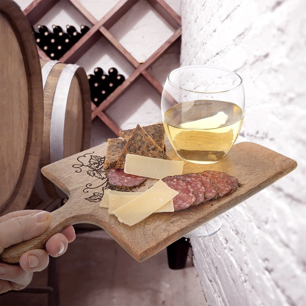 Tocătorul este ideal pentru brânzeturi, mezeluri, fructe și tapas. Mânerul ergonomic pentru transport facil și motivul gravat cu viță-de-vie subliniază aspectul său elegant pe masă.