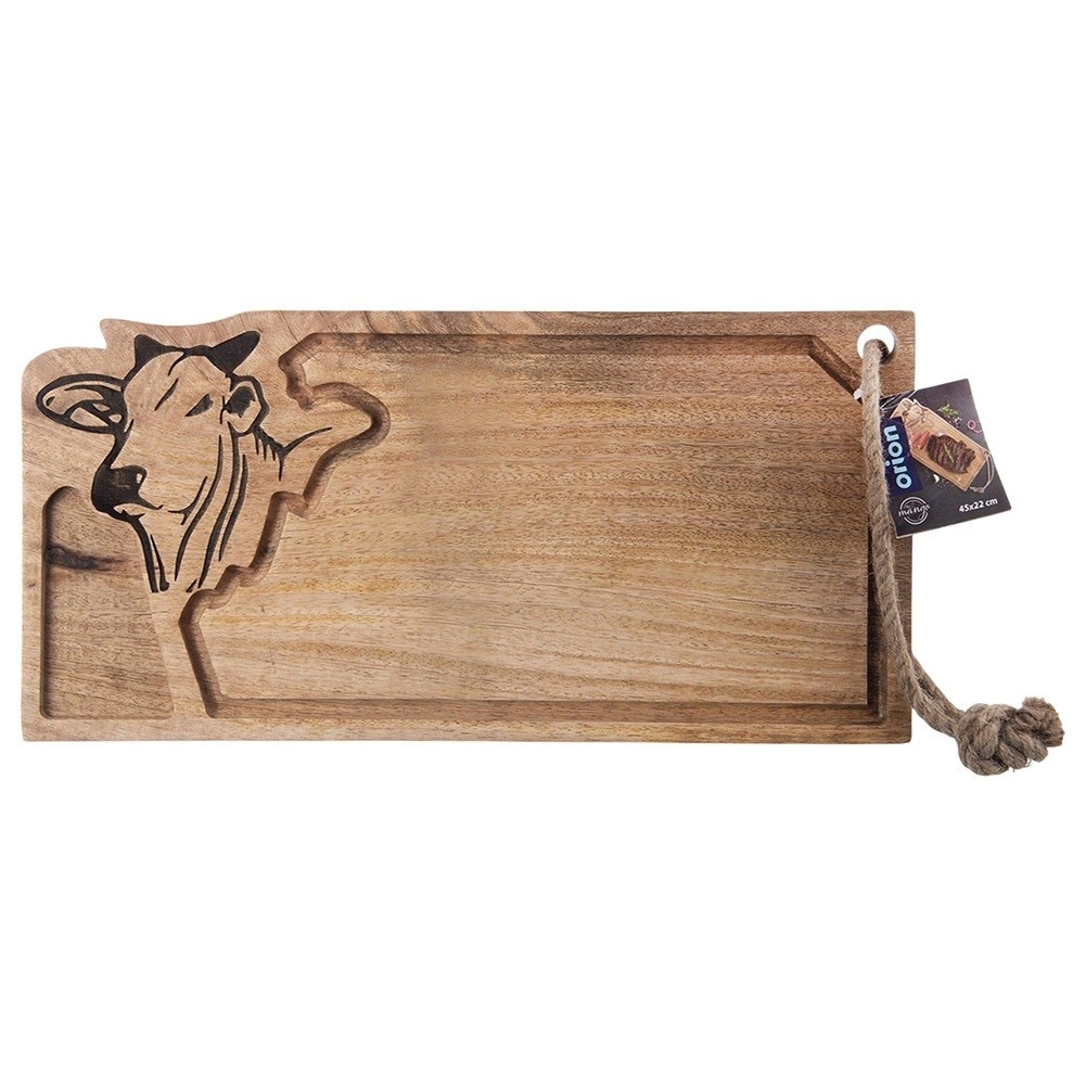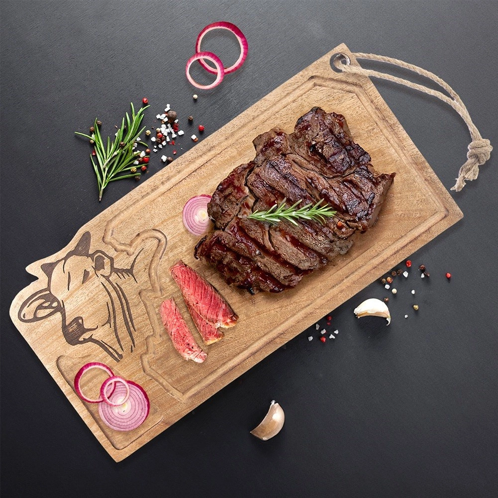 Descoperă tocătorul versatil din lemn de mango, remarcat prin robustețe, rezistență naturală și fibră frumoasă. Datorită șanțului pentru sucuri, păstrează blatul curat atunci când tai carne, fructe sau legume. Capul de taur gravat și șnurul pentru agățare îi evidențiază atât valoarea decorativă, cât și pe cea funcțională.
