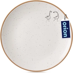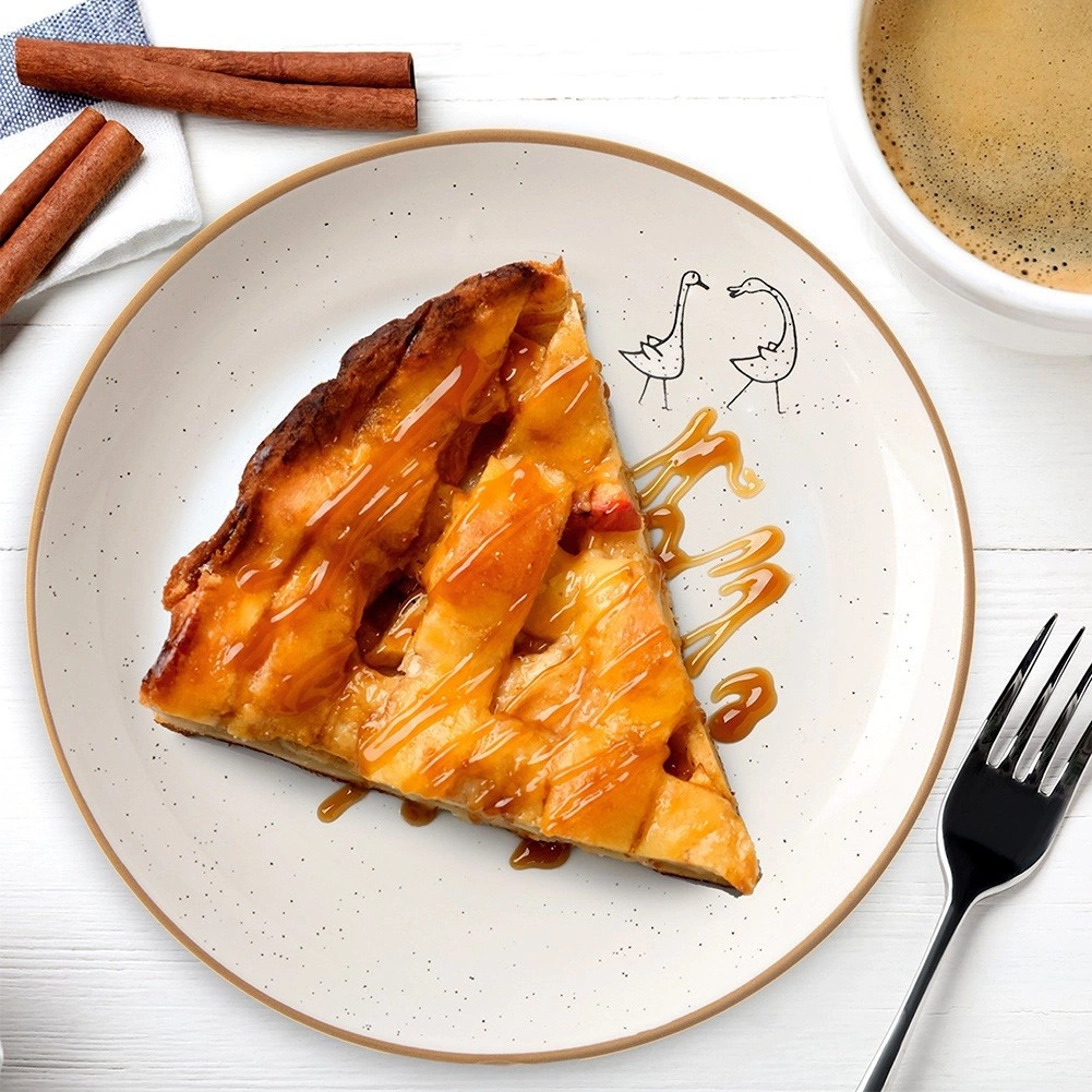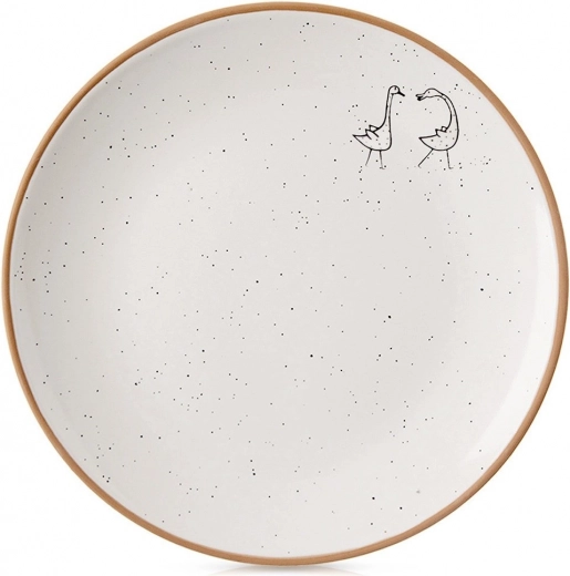 Farfurie de desert stilată, cu diametrul de 20 cm, din ceramică de calitate, în culoare bej cu picatele fine și margine naturală de gresie. Se potrivește excelent pentru servirea torturilor, deserturilor și gustărilor, atât acasă, cât și în restaurante. Este potrivită pentru mașina de spălat vase și cuptorul cu microunde, are formă clasică rotundă și design efectuos cu un relief discret cu motiv de gâște.