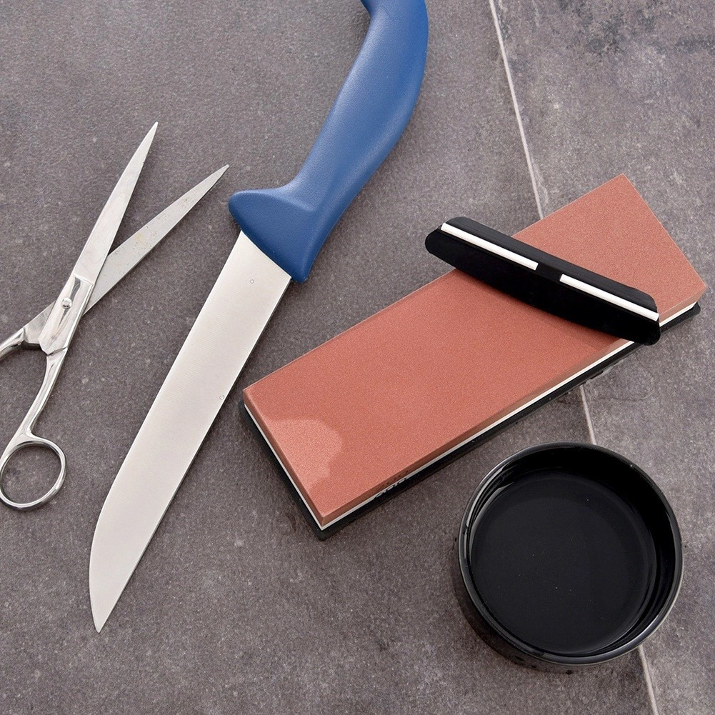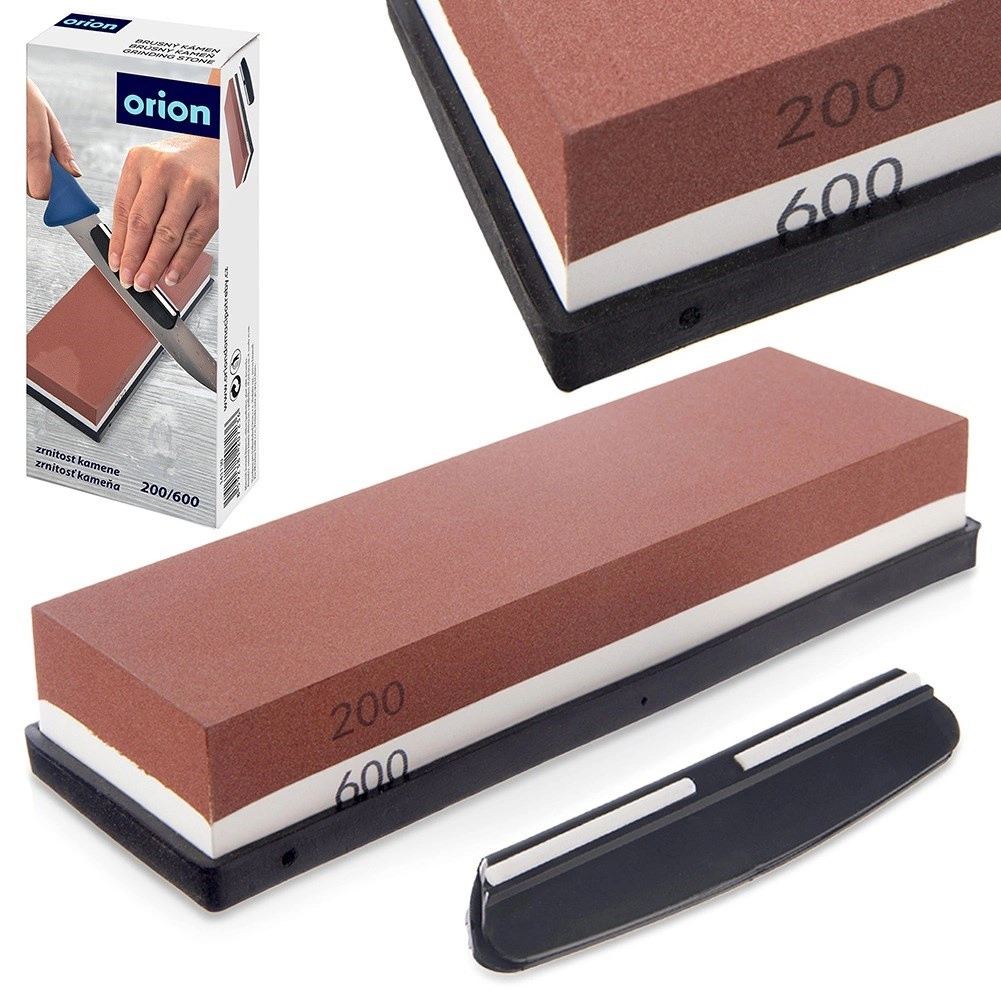 Piatra de ascuțit universală, cu două straturi, din corindon rezistent, ascuțește cuțite de bucătărie, foarfece, dălți și unelte de grădină. Granulația 200 reface rapid tăișul, iar granulația 600 îl netezește și îl lustruiște. Include clemă de ghidare (15–20°) pentru un unghi consecvent și ghidaj sigur al lamei.