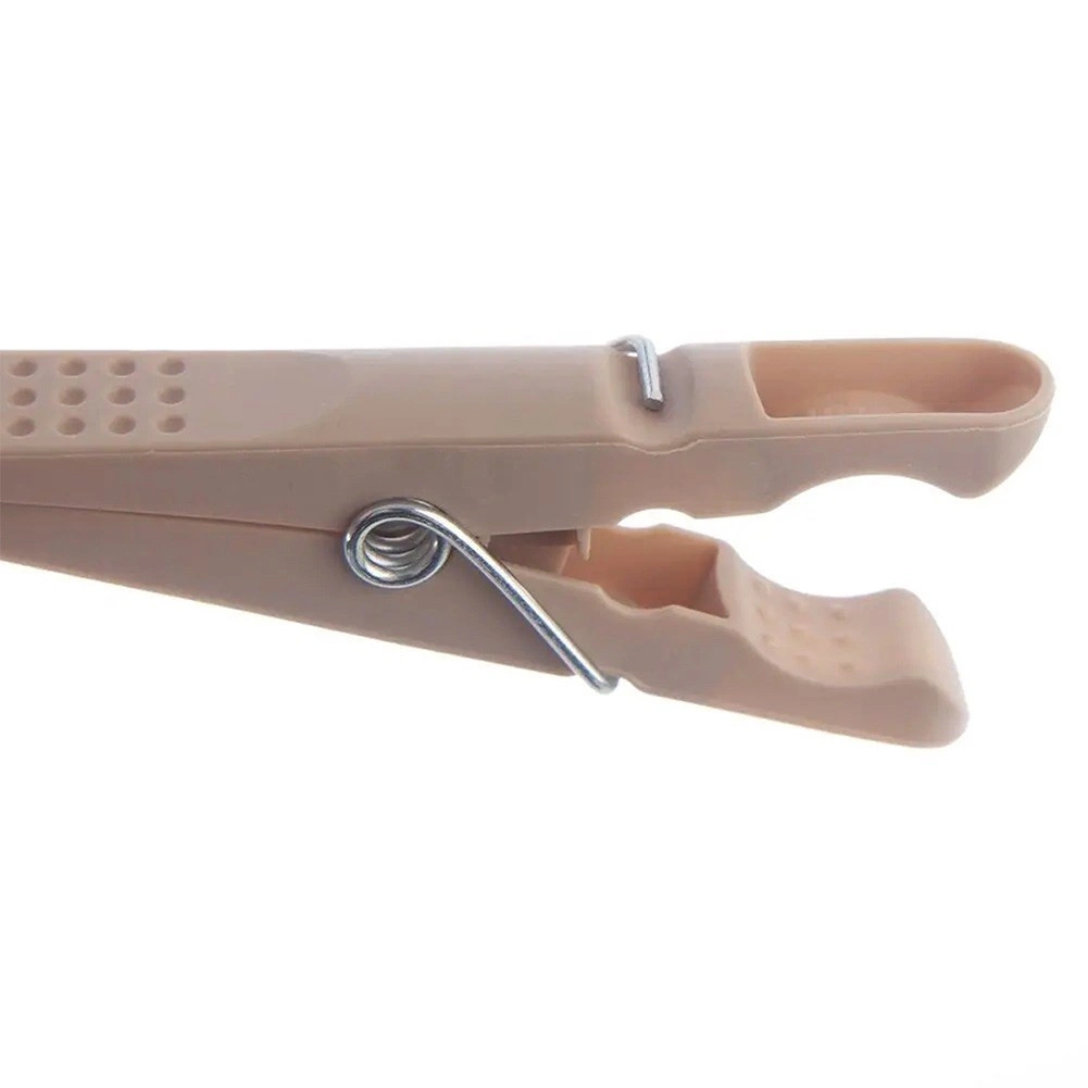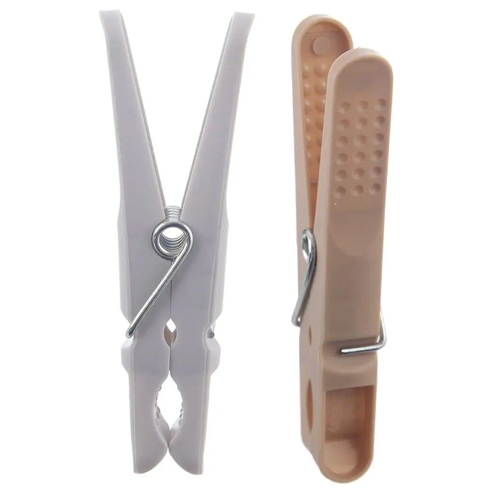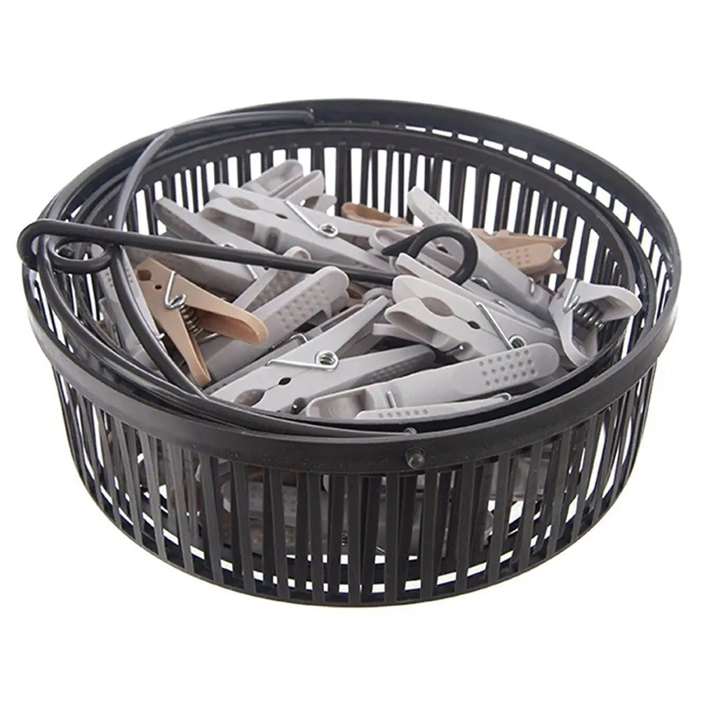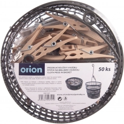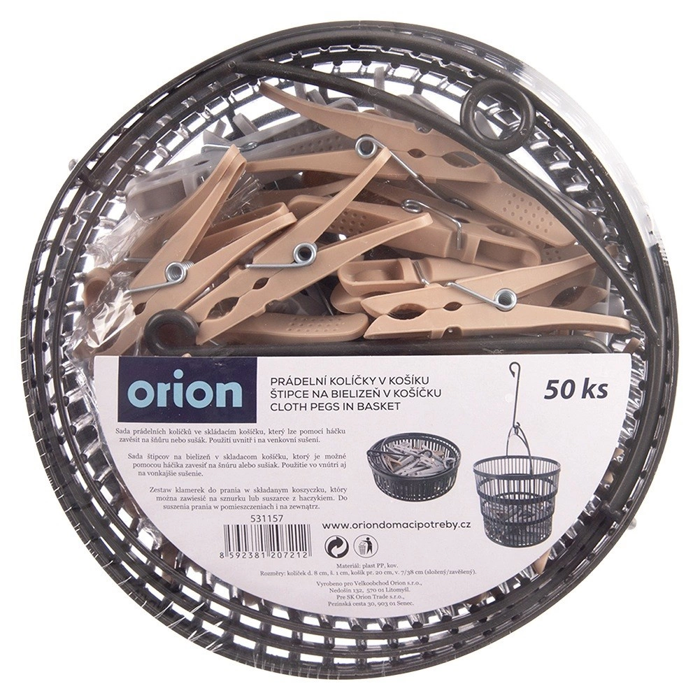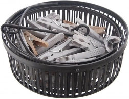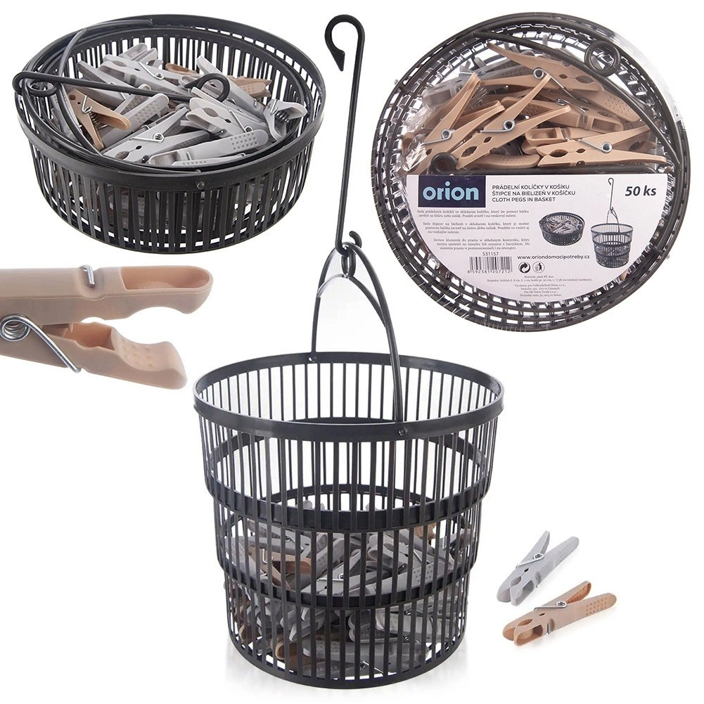 Setul conține 50 de cleme rezistente într-un coș practic, care poate fi agățat de uscător sau sfoară. Construcția deschisă și ventilată a coșului asigură scurgerea apei și uscarea rapidă, astfel încât clemele sunt mereu la îndemână. Clemele în culori gri și bej sunt realizate din plastic de calitate, cu arc metalic, pentru o durată de viață îndelungată.