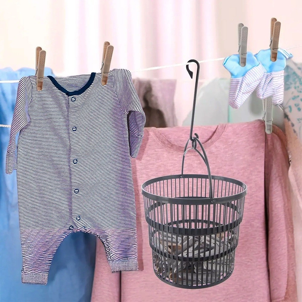 Coșul se agață ușor de sfoară sau bară. Pereții ventilați grăbesc uscarea clemelor și facilitează accesul rapid la acestea.