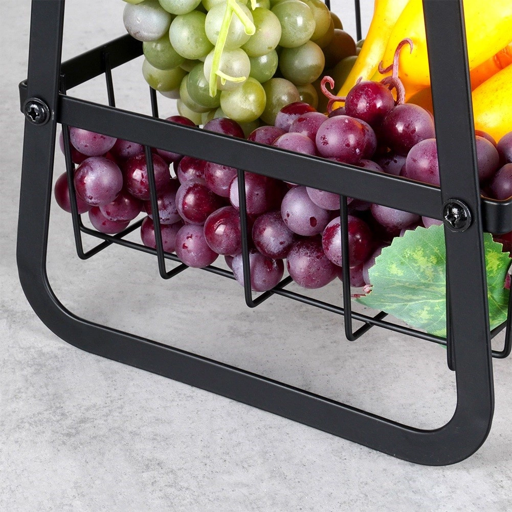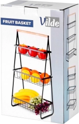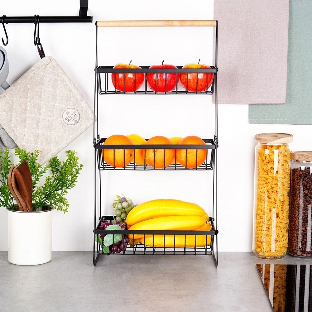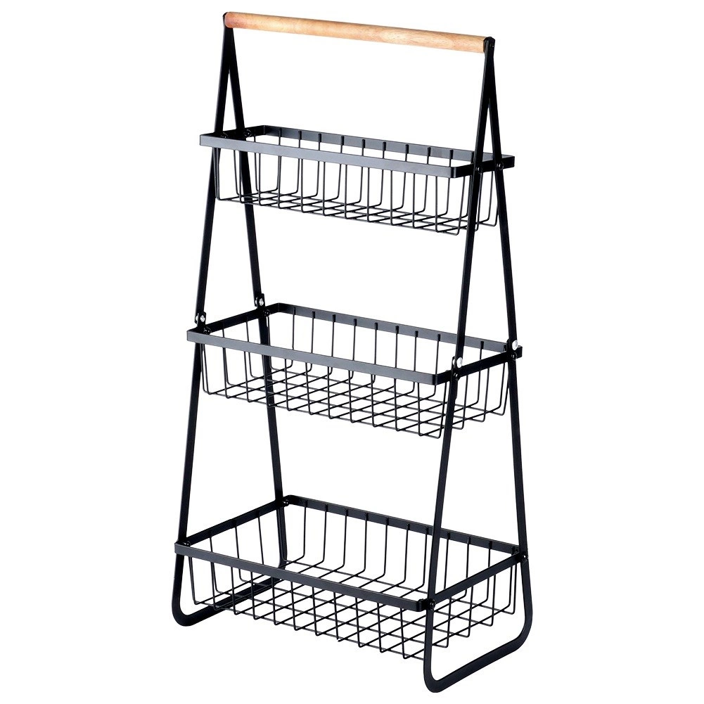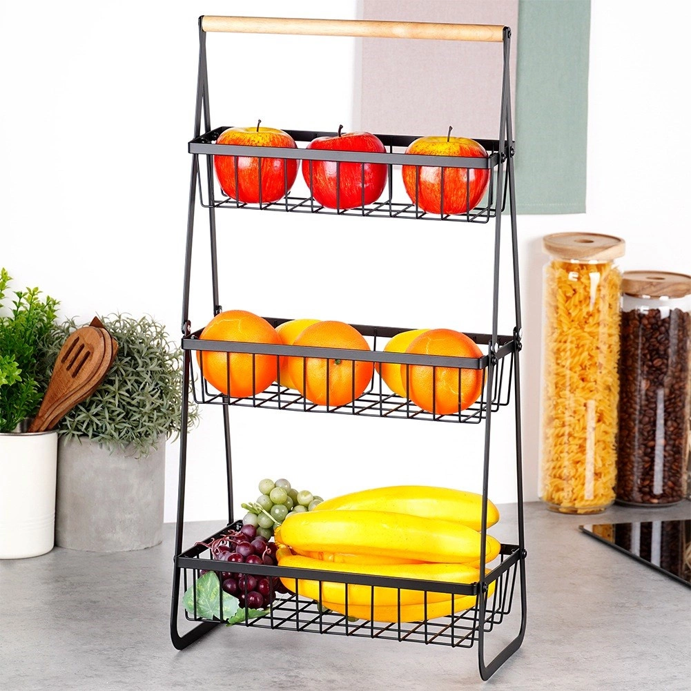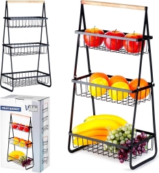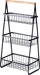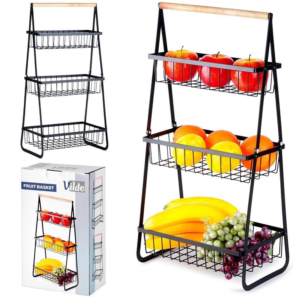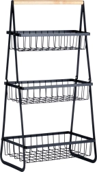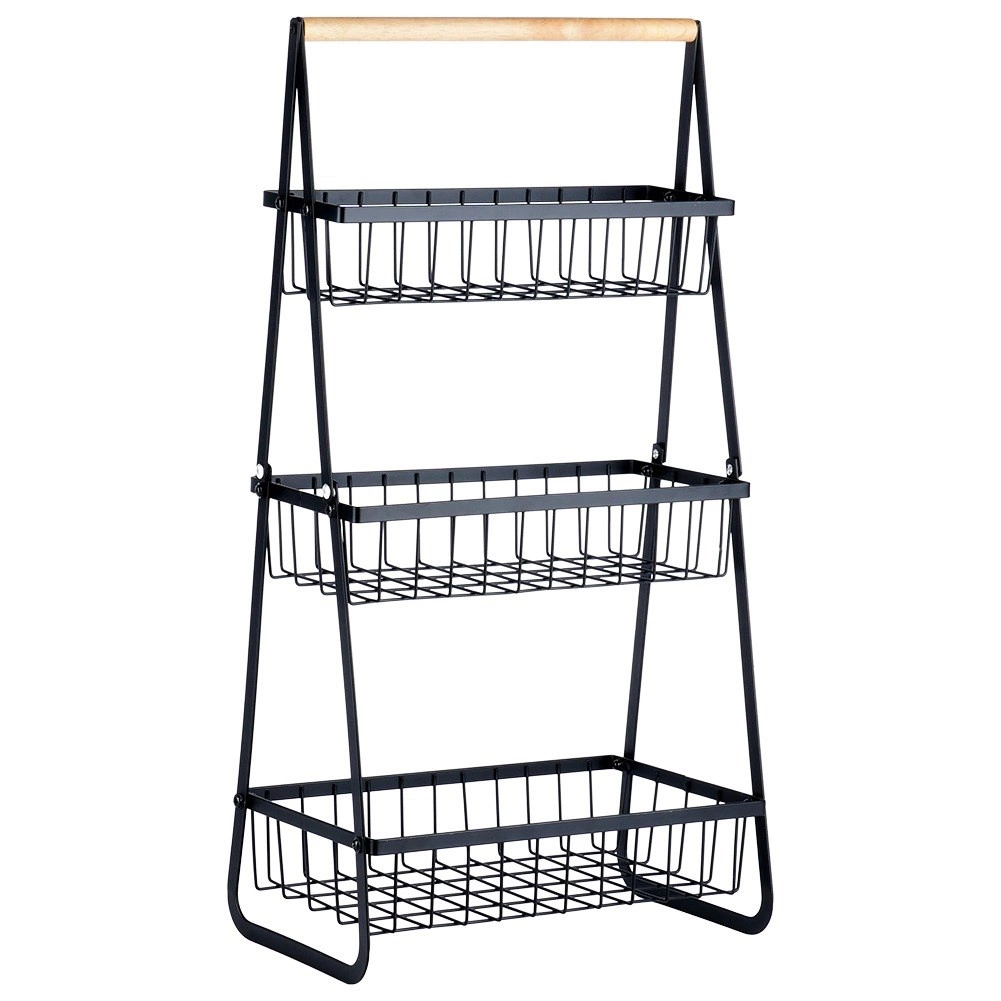 Coș elegant pe trei niveluri pentru fructe și legume, din metal rezistent, de culoare neagră, cu mâner din lemn, asigură organizare clară, economisire de spațiu și circulație excelentă a aerului pentru prospețime prelungită. Datorită coșurilor deschise din sârmă, conținutul este mereu la vedere și la îndemână.