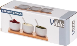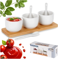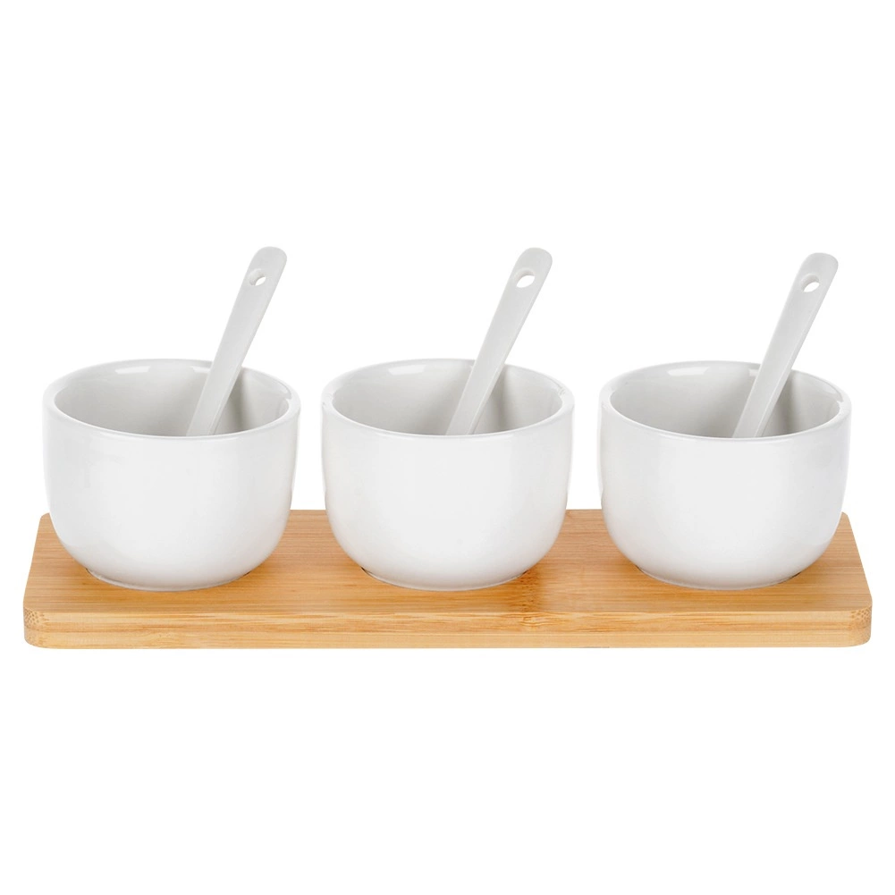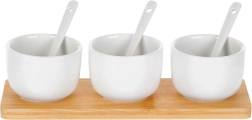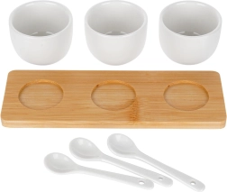 Acest set din 7 piese combină designul minimalist și detaliile practice pentru masa de zi cu zi sau ocazii festive. Trei boluri ceramice albe, netede (90 ml) sunt plasate în locașuri frezate cu precizie în tava de bambus, astfel încât nu se mișcă în timpul transportului. Setul include și lingurițe ceramice asortate pentru servire comodă.