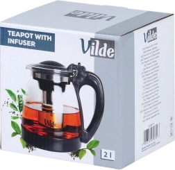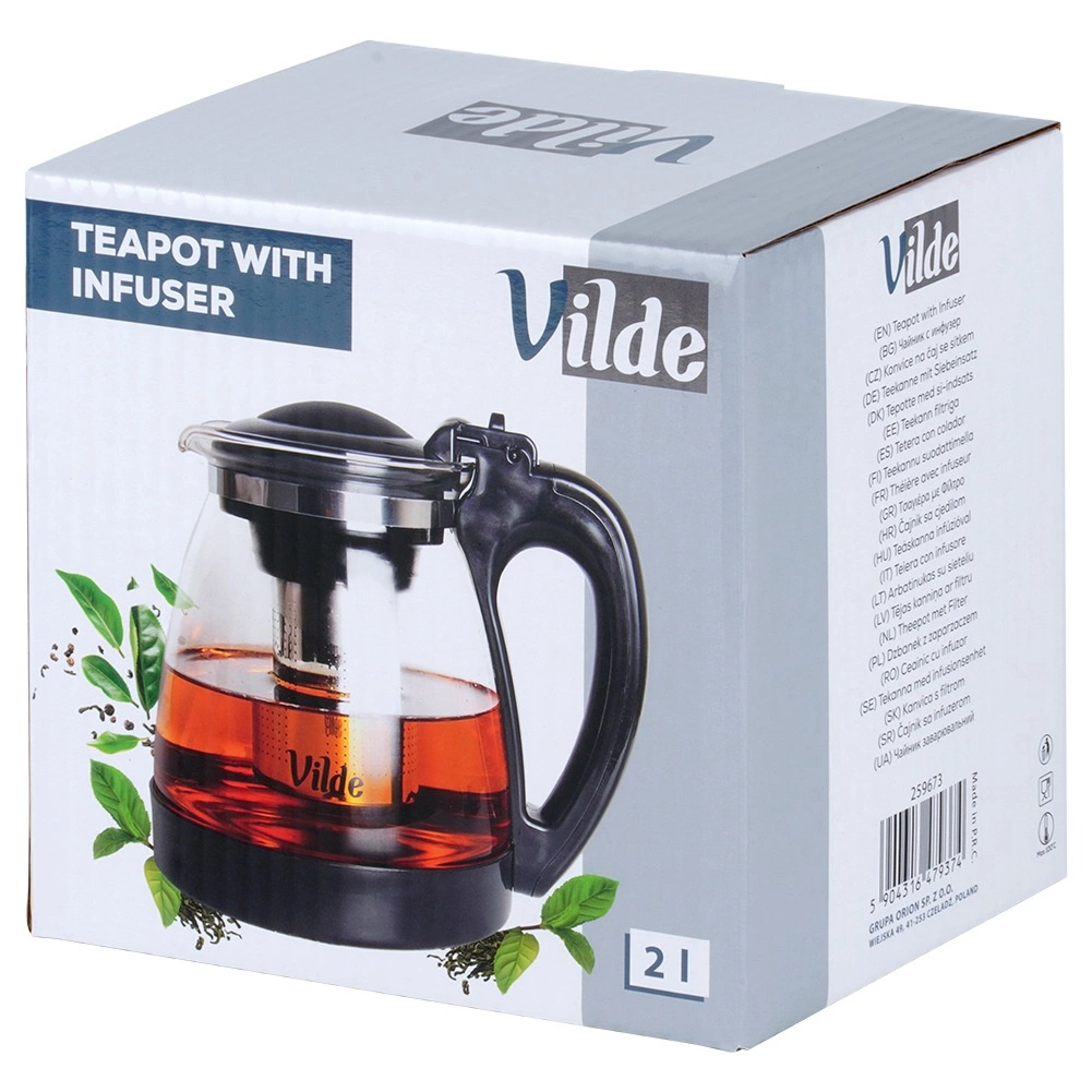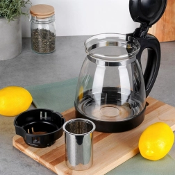 Ceainic elegant din sticlă, cu capacitate de 2 l și infuzor din inox detașabil pentru ceai vrac și plante. Fabricat din sticlă borosilicată rezistentă, cu prindere confortabilă, capac rabatabil și cioc turnător precis. Ideal pentru prepararea ceaiului fără reziduuri, băuturilor calde și reci și servire ușoară.