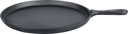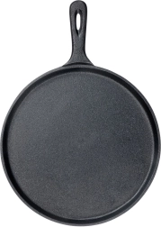 Această tigaie din fontă cu diametrul de 26 cm oferă o suprafață lată, joasă și complet plană, ideală pentru clătite subțiri, tortilla sau turte. Fonta asigură coacere uniformă și păstrarea îndelungată a căldurii, astfel încât mâncarea rămâne caldă mai mult timp. Mânerul ergonomic, cu orificiu pentru agățare, facilitează manipularea și depozitarea.