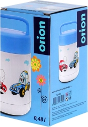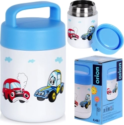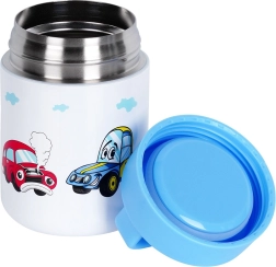 Termos pentru mâncare, stilat și funcțional, cu motiv pentru copii cu mașinuțe, ideal pentru supe, piureuri, paste, salate și fructe. Datorită construcției din oțel inoxidabil este rezistent, igienic și menține conținutul la temperatura optimă. Gura largă permite servirea comodă direct din recipient și curățarea ușoară.