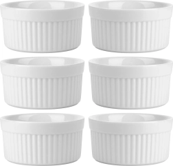 Set practic de șase boluri albe pentru copt, cu volum de 260 ml, oferă o soluție elegantă pentru coacere și servire. Bolurile din ceramică de calitate sunt rezistente la temperaturi de până la 350 °C, potrivite pentru cuptor, cuptor cu microunde și mașină de spălat vase. Datorită designului clasic striat și glazurii netede, sunt ideale pentru crème brûlée, sufleuri, porții mici gratinate, sosuri sau gustări.