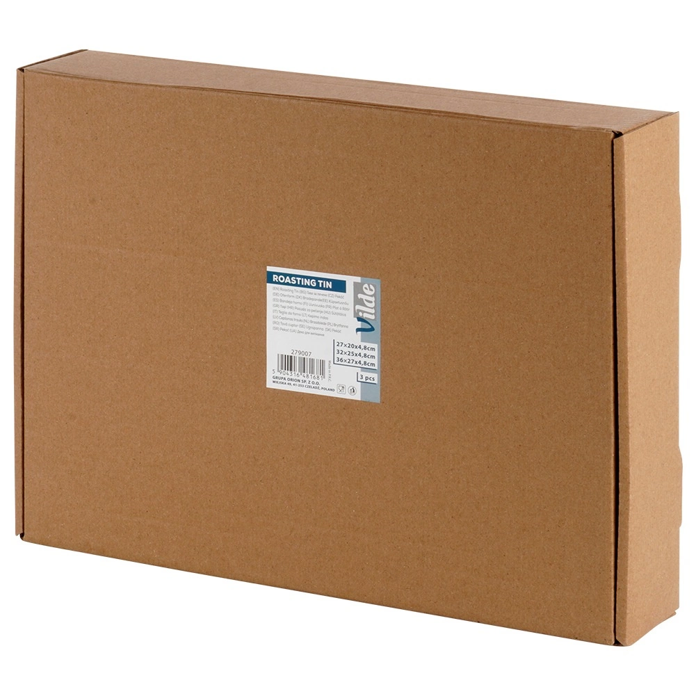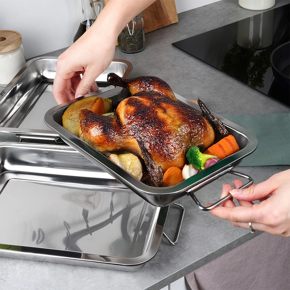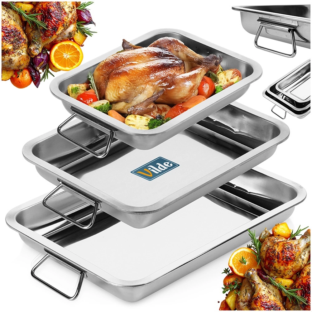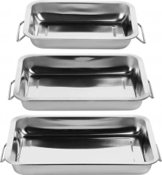 Setul de trei tăvi din inox, în dimensiuni diferite, este ideal pentru coacere în familie sau uz gastro. Pereții groși și oțelul inoxidabil de calitate asigură distribuția uniformă a căldurii și durabilitate. Mânerele laterale rabatabile permit transportul în siguranță și economisesc spațiu la depozitare.