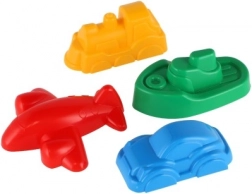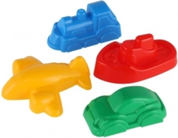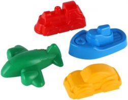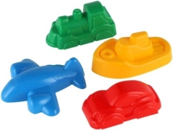 Acest set de 4 forme pentru nisip în formă de tren, barcă, avion și mașinuță transformă orice groapă de nisip sau plajă într-o lume plină de imaginație. Datorită dimensiunilor compacte (aprox. 8–10 cm) se țin bine în mână și se răstoarnă ușor pentru a obține forme perfect conturate.