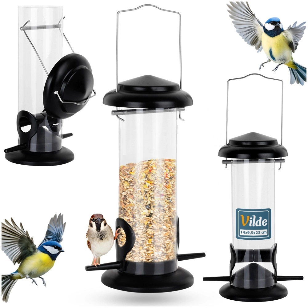 Mențineți grădina plină de viață cu hrănitorul Vilde. Tubul transparent permite verificarea imediată a stocului, în timp ce capacul și baza metalice solide asigură durată lungă de viață chiar și în condiții exterioare solicitante. Datorită mânerului practic, hrănitorul se agață ușor de o ramură sau de un cârlig.